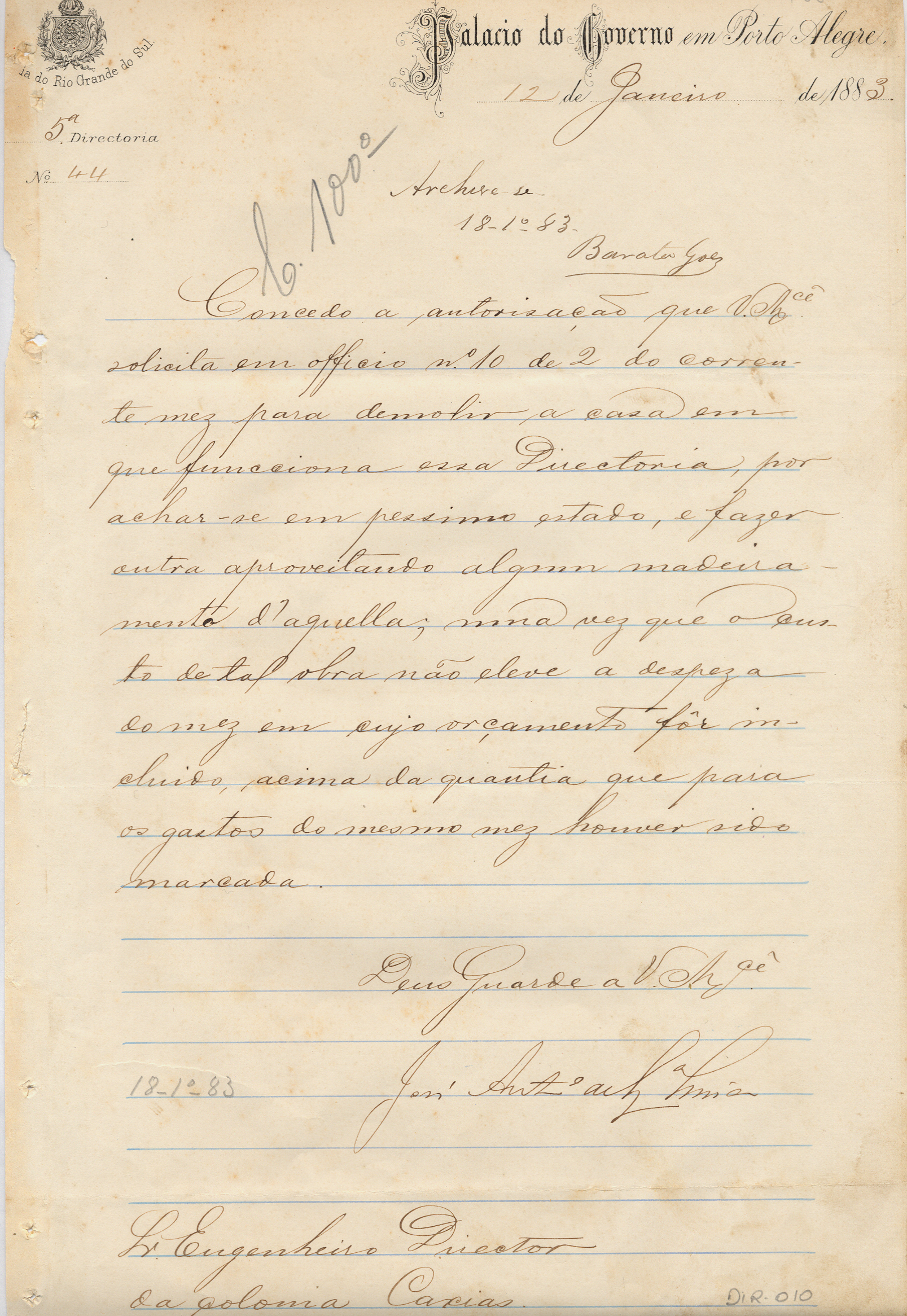 Do Palácio do Governo - 5ª Diretoria - Sr. José Antonio de S. Lima, para o Engenheiro Diretor da Colônia Caxias. Assunto: autorização para demolição do prédio da Diretoria (em péssimo estado), e construção de outro. Local: Porto Alegre.