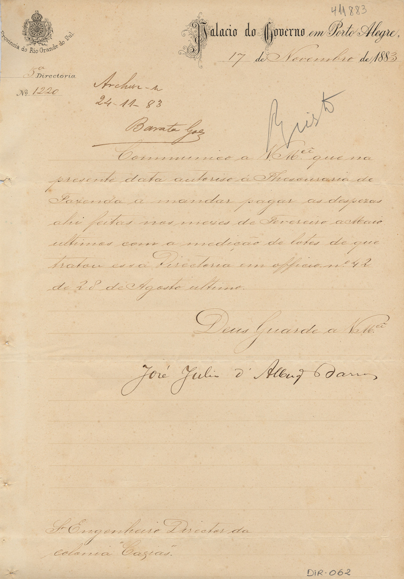 Do Palácio do Governo - 5ª Diretoria - José Júlio de Albuquerque Barros, para o Engenheiro Diretor da Colônia Caxias. Assunto: autoriza a Tesouraria de Fazenda a pagar as despesas feitas com a medição de lotes nos meses de fevereiro à maio. Local: Porto Alegre.