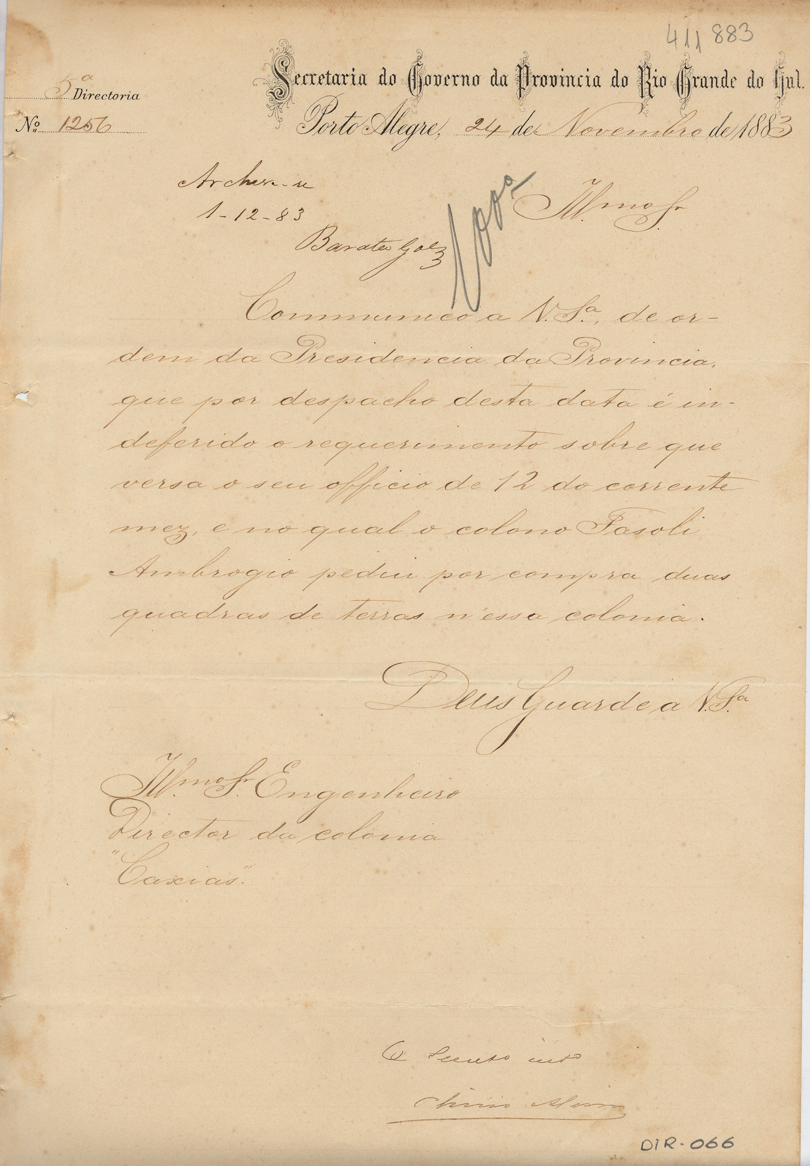 Da Secretaria do Governo da Província do RS - 5ª Diretoria, para o Engenheiro Diretor da Colônia Caxias. Assunto: indefere requerimento do colono Fasoli Ambrogio, solicitando por compra duas quadras de terras na colônia. Local: Porto Alegre.