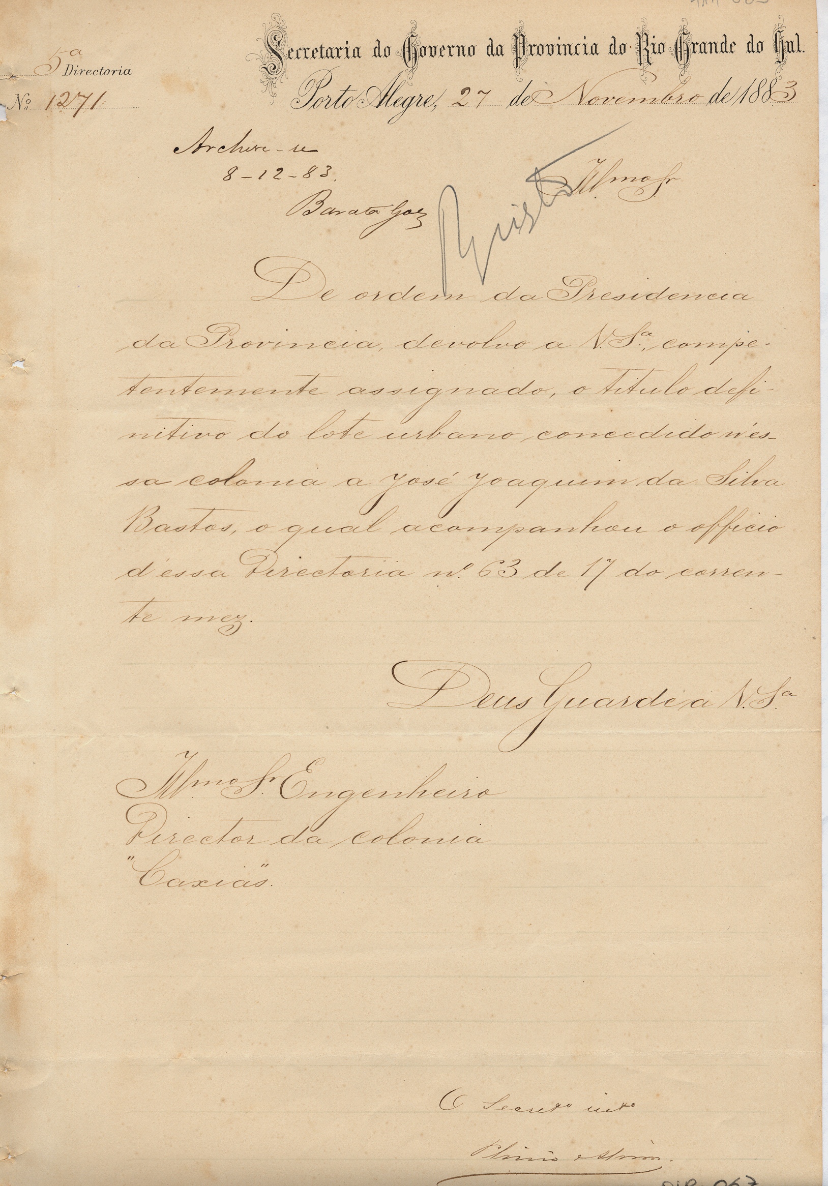 Da Secretaria do Governo da Província do RS - 5ª Diretoria, para o Engenheiro Diretor da Colônia Caxias. Assunto: comunica devolução de título definitivo do lote urbano concedido a José Joaquim da Silva Bastos, nessa colônia. Local: Porto Alegre.