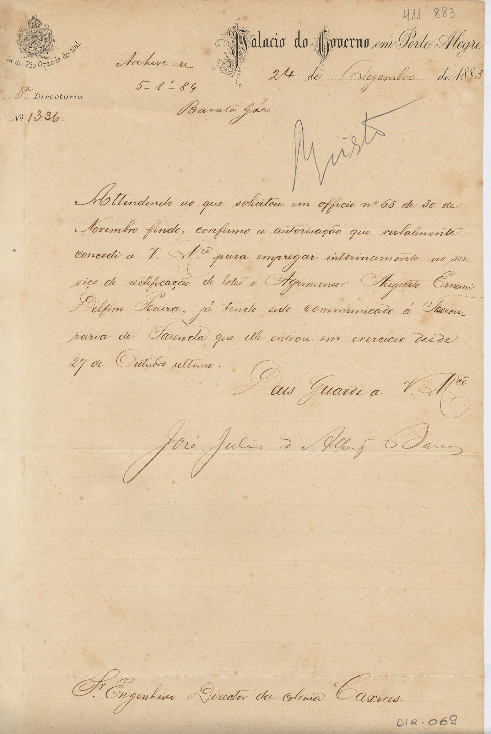 Do Palácio do Governo - 5ª Diretoria - José Júlio de Albuquerque Barros, para o Engenheiro Diretor da Colônia Caxias. Assunto: confirma autorização para empregar no serviço de retificação de lotes o agrimensor Augusto Ernani Delfim Pereira. Local: Porto Alegre.