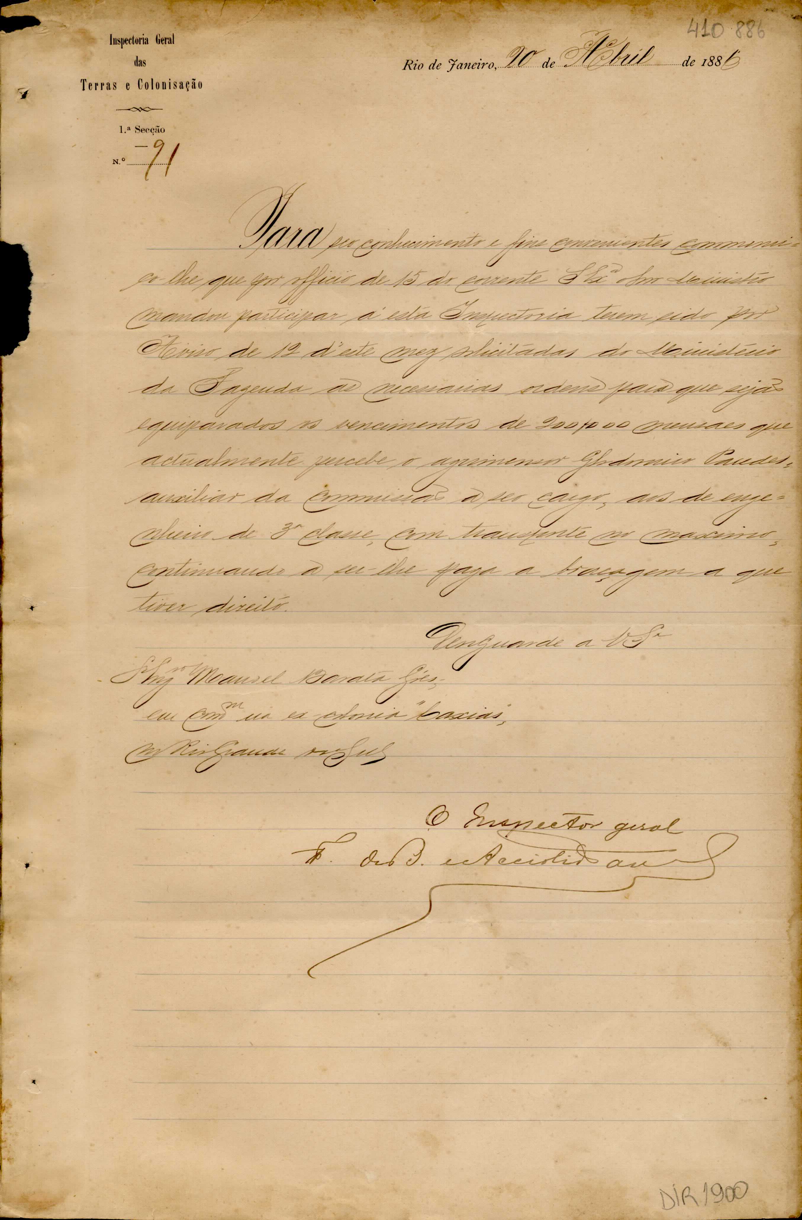 De Francisco de Barros e Accioli de Vasconcellos - Inspetor Geral das Terras e Colonização no RJ, para Manoel Barata Góes - Engenheiro Chefe de Medições na ex-Colônia Caxias. Assunto: instrução sobre equiparação de salário do agrimensor Glodomiro Paredes.