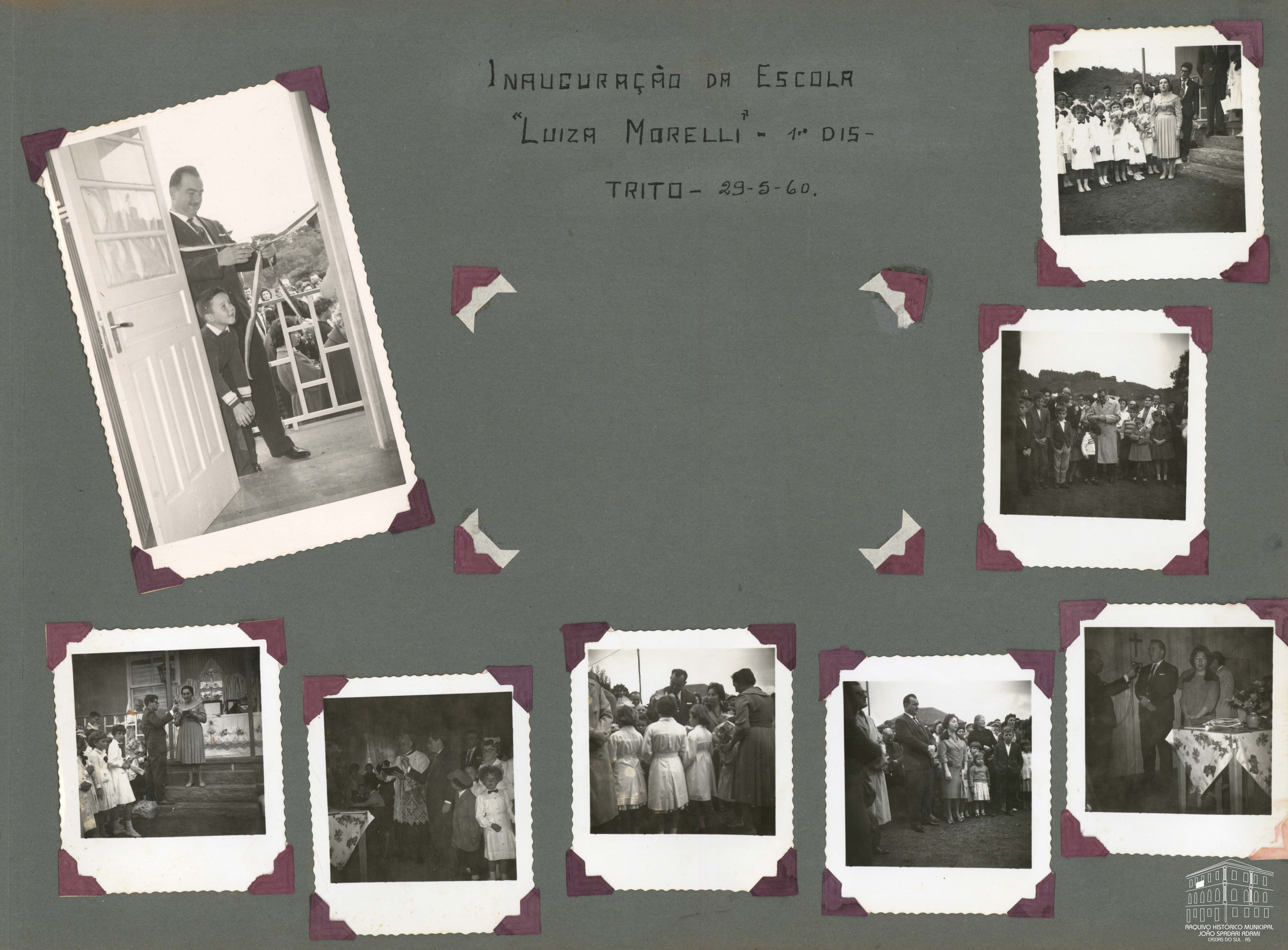 Foto 19: Grupo de pessoas na inauguração da Escola Luiza Morelli, localizada no 1º Distrito, em 25 de setembro de 1960. Ao centro, homem de capa clara.