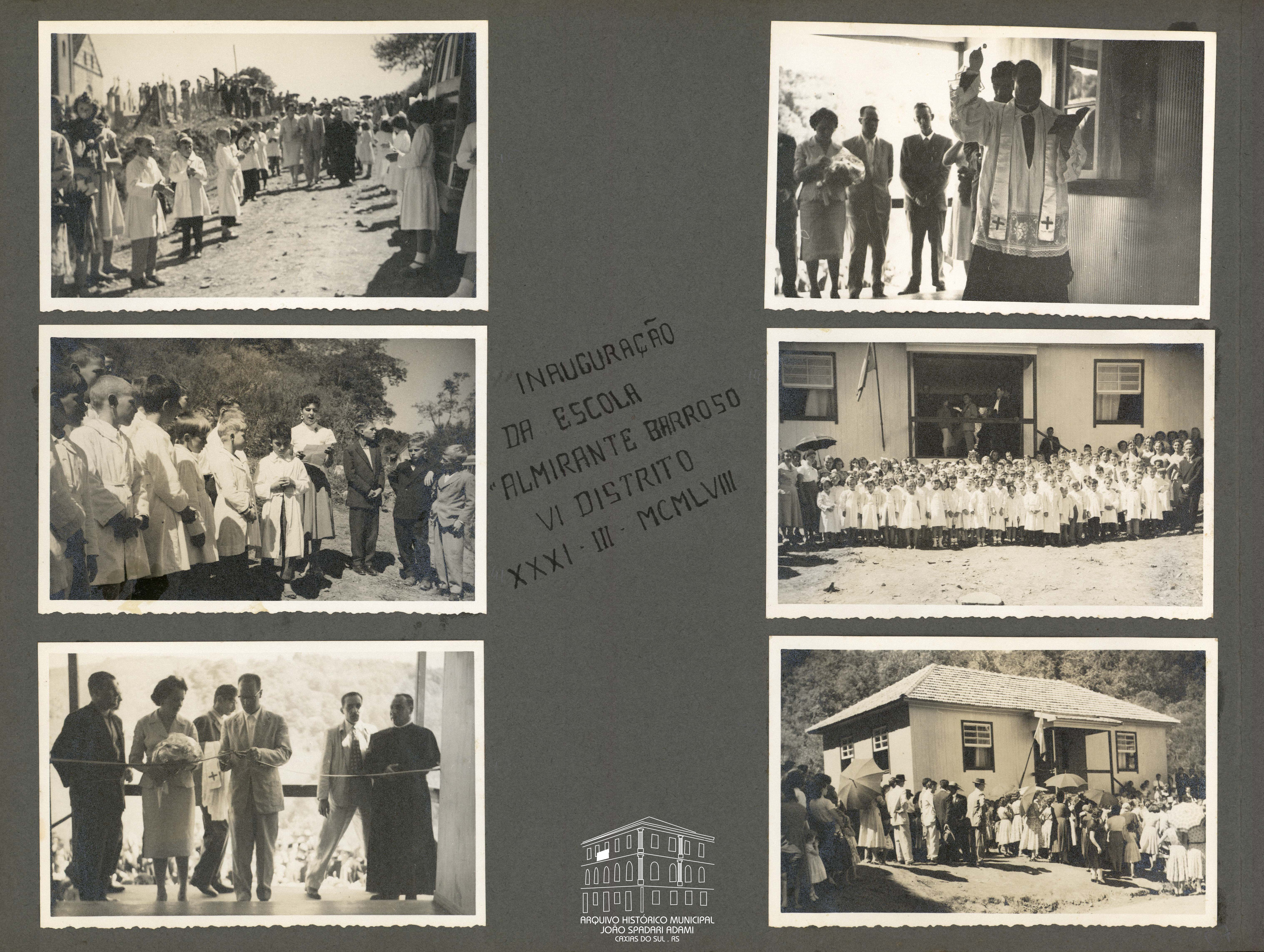 Foto 41: Alunos uniformizados, três meninos de terno e a professora (com papel na mão), na inauguração da Escola Almirante Barroso, situada no 6° distrito, em 31 de março de 1958.