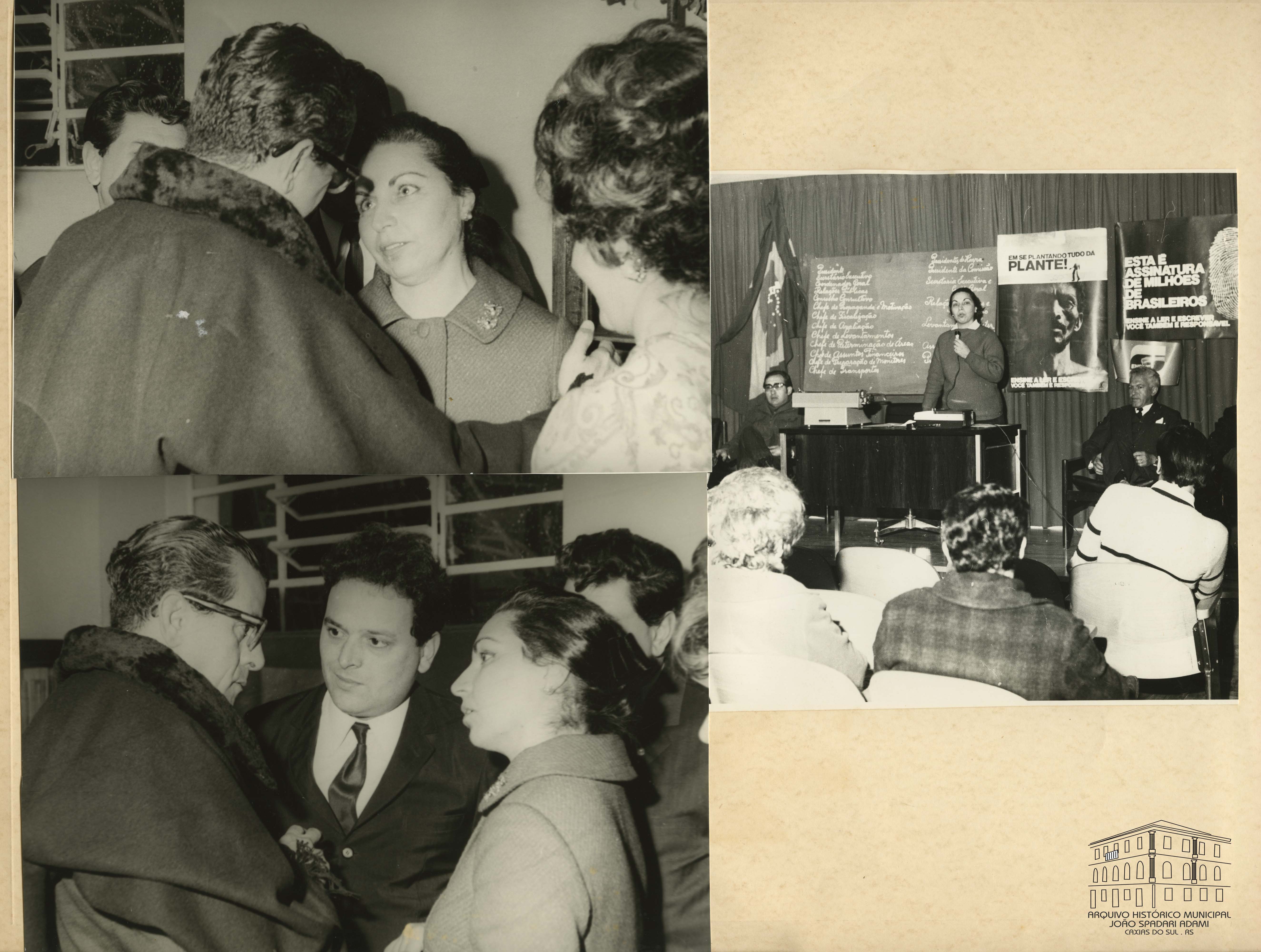 Fotografia 28: Ao microfone, Secretária Municipal da Educação e Cultura, Hilda Bazo. À direita, sentado, Prefeito Victorio Trez.