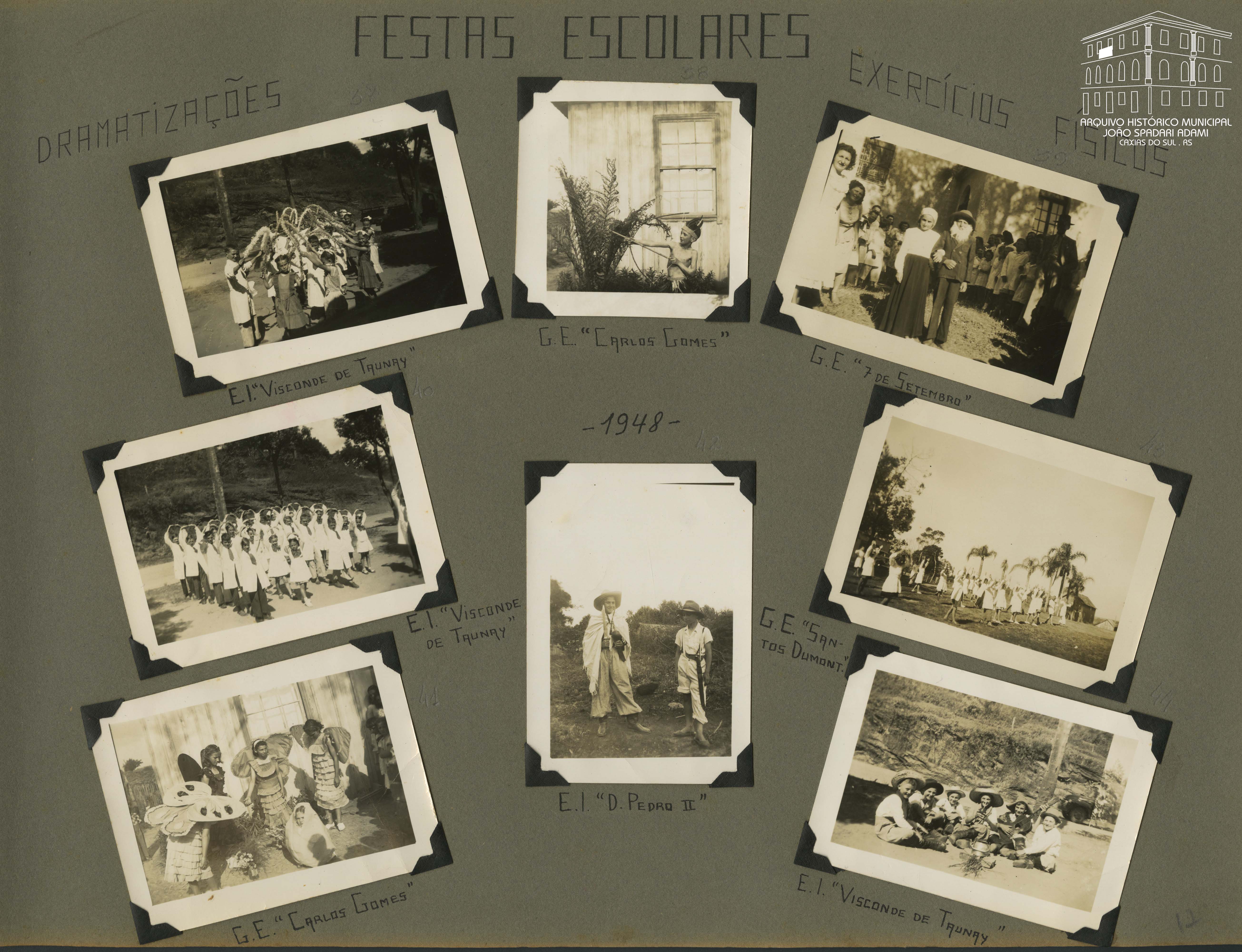 Foto 37: Grupo de alunos da Escola Isolada Visconde de Taunay, situada na Linha Cristina, Galópolis, segurando arcos, em uma dramatização, no ano de 1948.