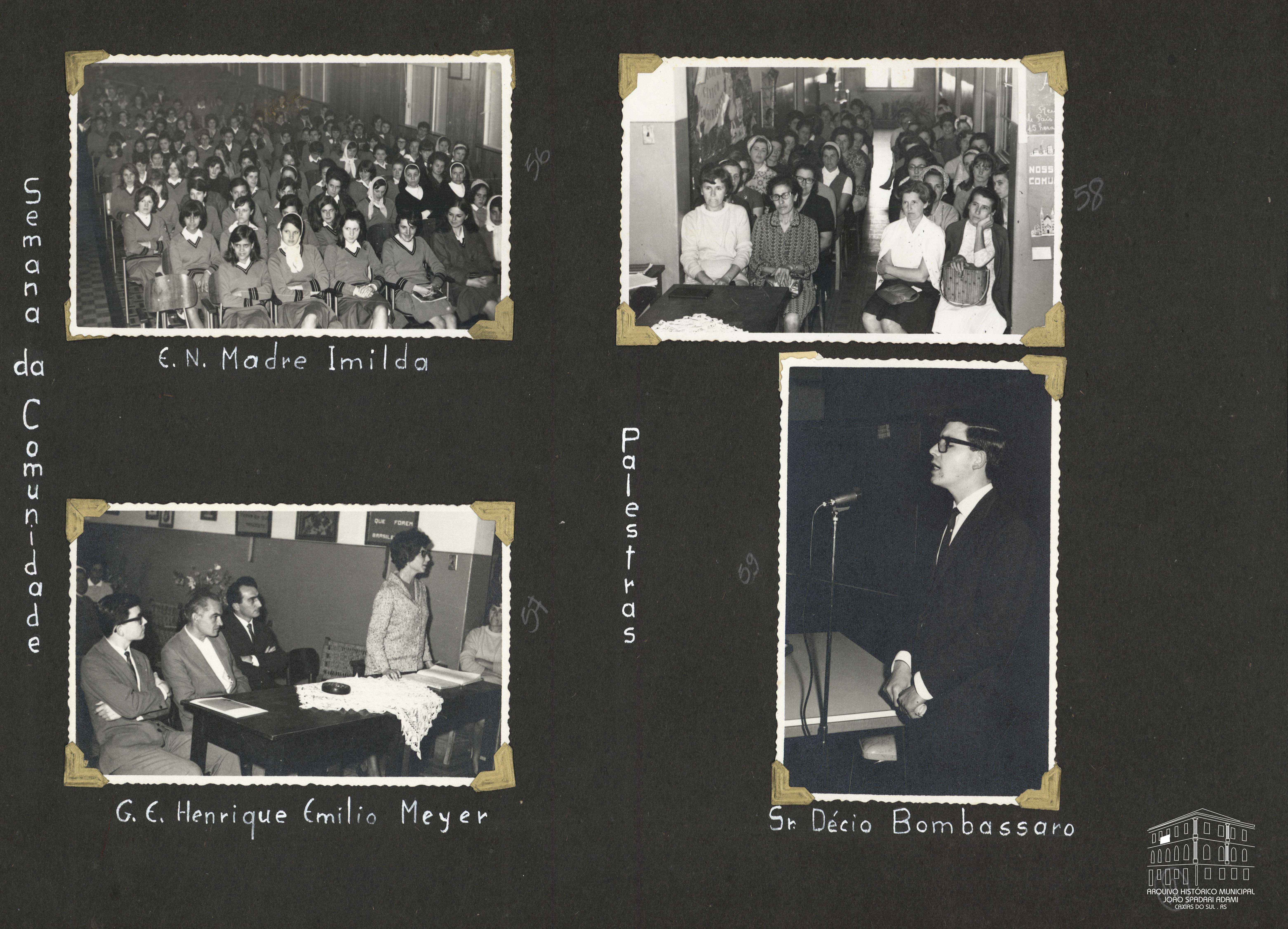 Foto 57: Três homens, sentados, e uma mulher, em pé, na palestra realizada no Grupo Escolar Emílio Meyer, durante a Semana da Comunidade.