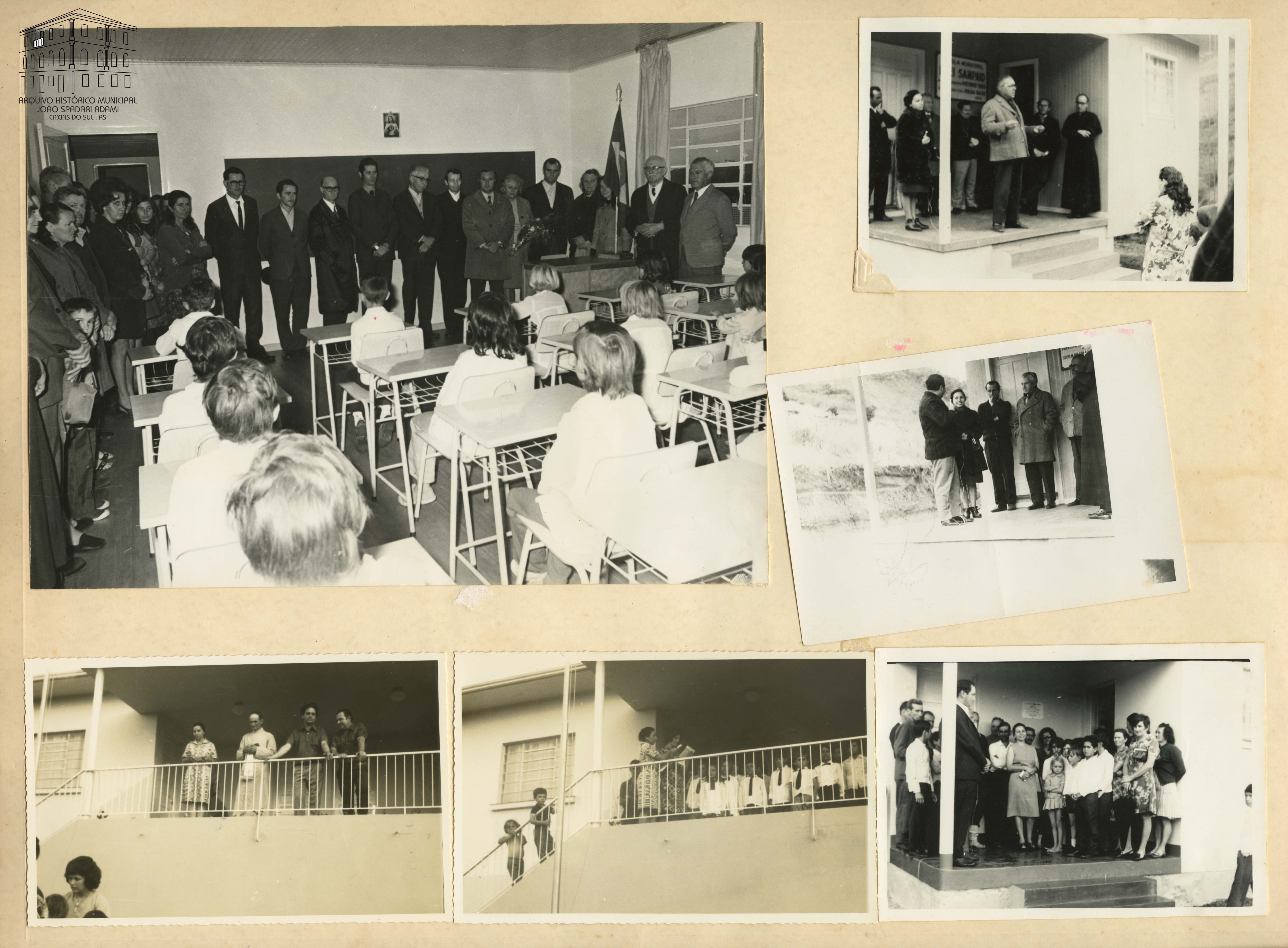 Fotografia 99: Autoridades e alunos, em 06 de junho de 1972, em uma sala de aula do novo prédio do Grupo Escolar Municipal Armindo de Carli, situado no Travessão Porto, em Ana Rech. Da direita para esquerda, próximo à janela, Prefeito Victorio Trez.