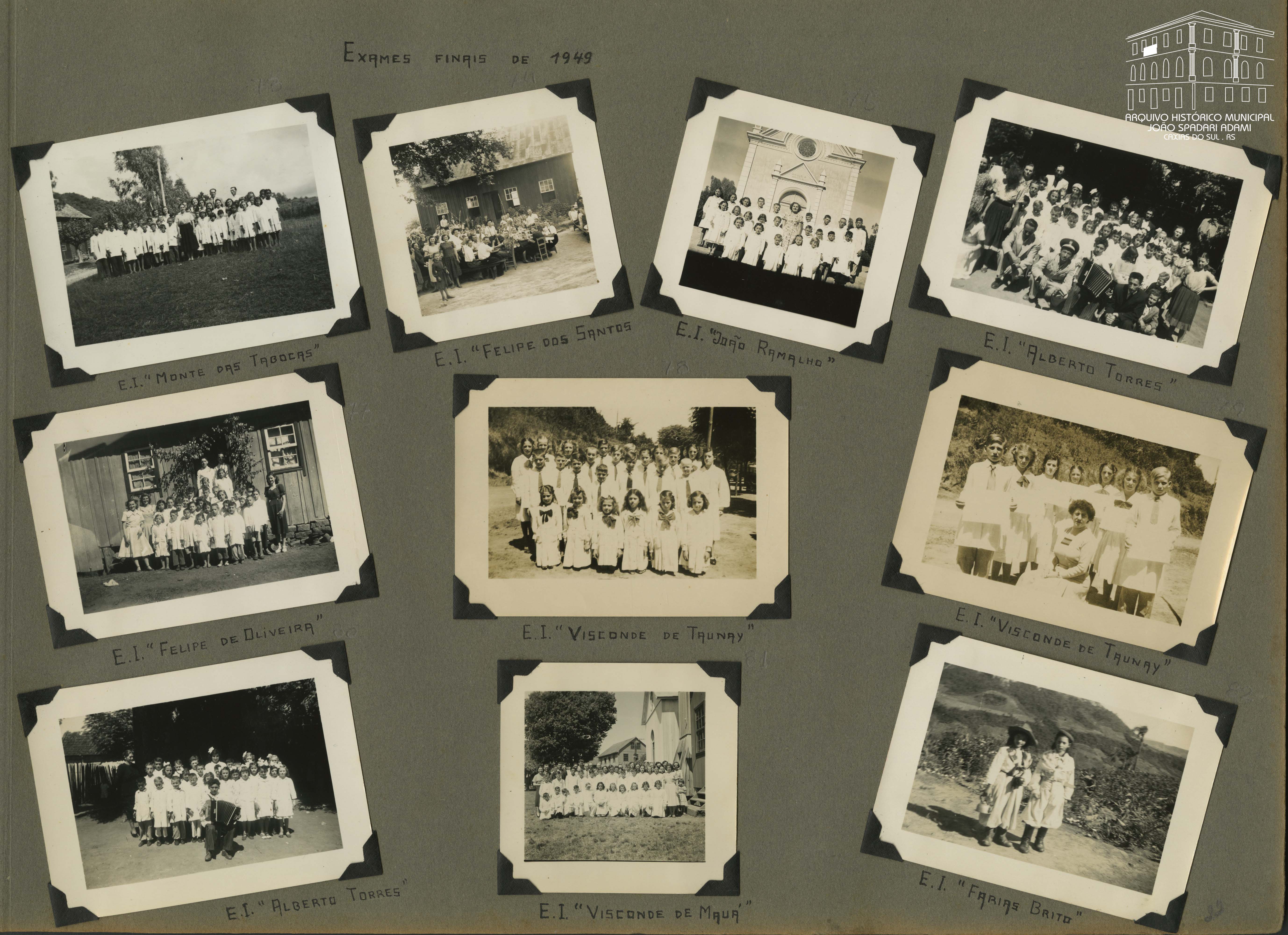 Foto 77: Professoras e alunos na frente da Escola Isolada Felipe de Oliveira, situada na Linha Sertória Baixa, Distrito de Santa Lúcia do Piaí, em 1949, em dia de exames finais.