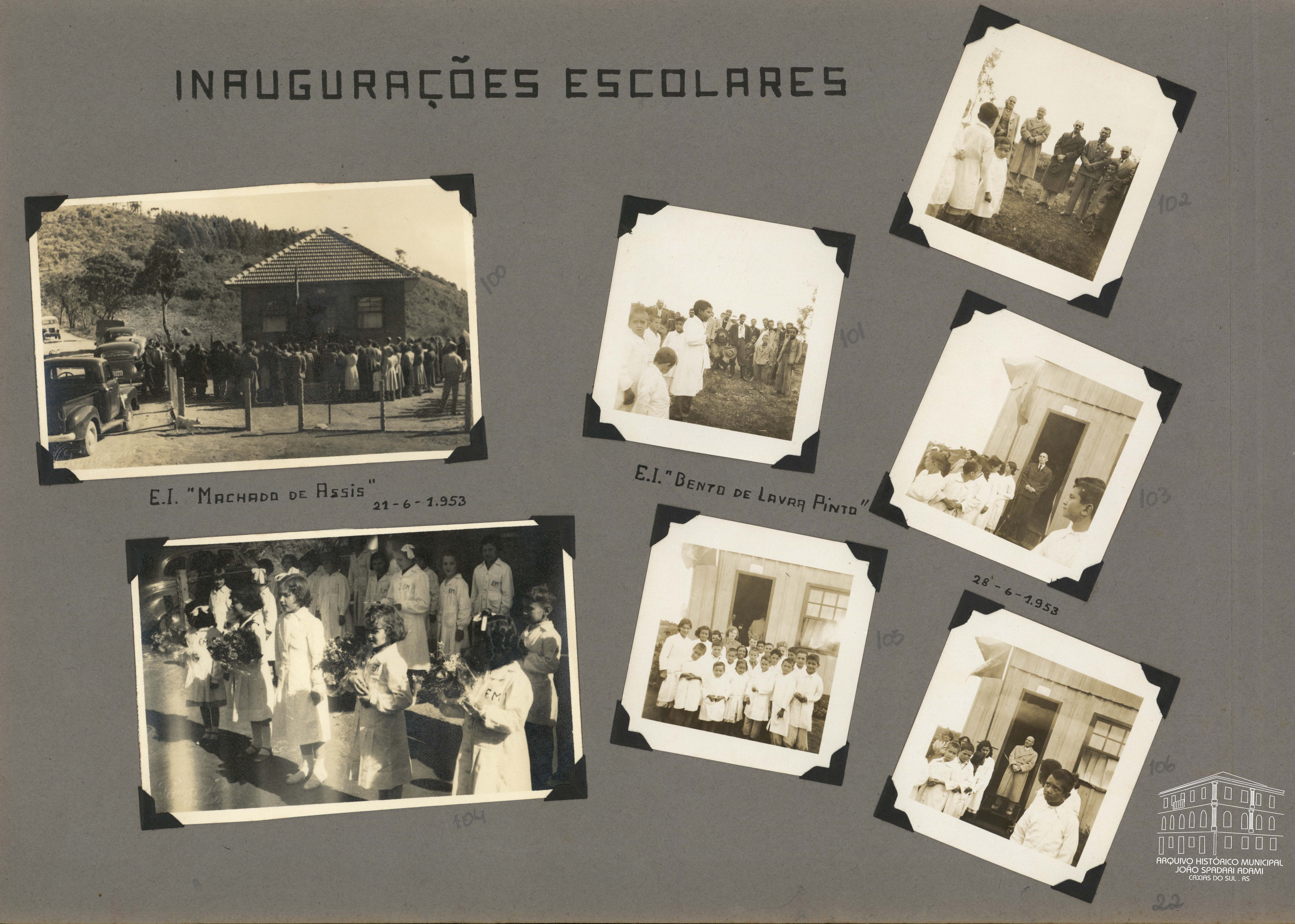 Foto 102:Alunos e autoridades na inauguração da Escola Isolada Bento de Lavra Pinto, em 28 de junho de 1953. Da esquerda para direita, 2º, Prefeito Euclides Triches.
