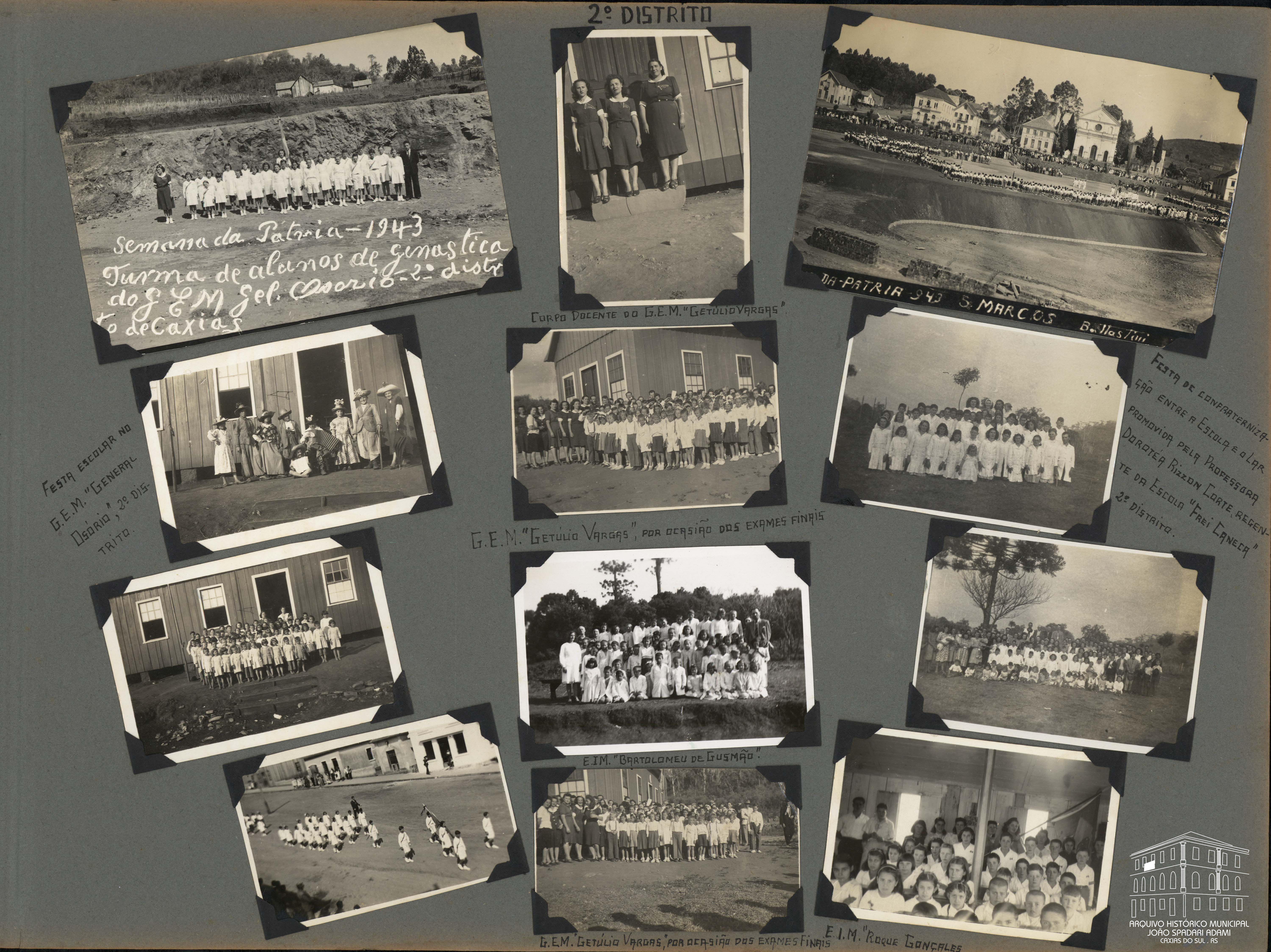 Foto 58: Em frente à igreja, alunos e comunidade em comemoração ao Dia da Pátria de 1943, na localidade de São Marcos, no 2º Distrito. Fotógrafo: Battastini.