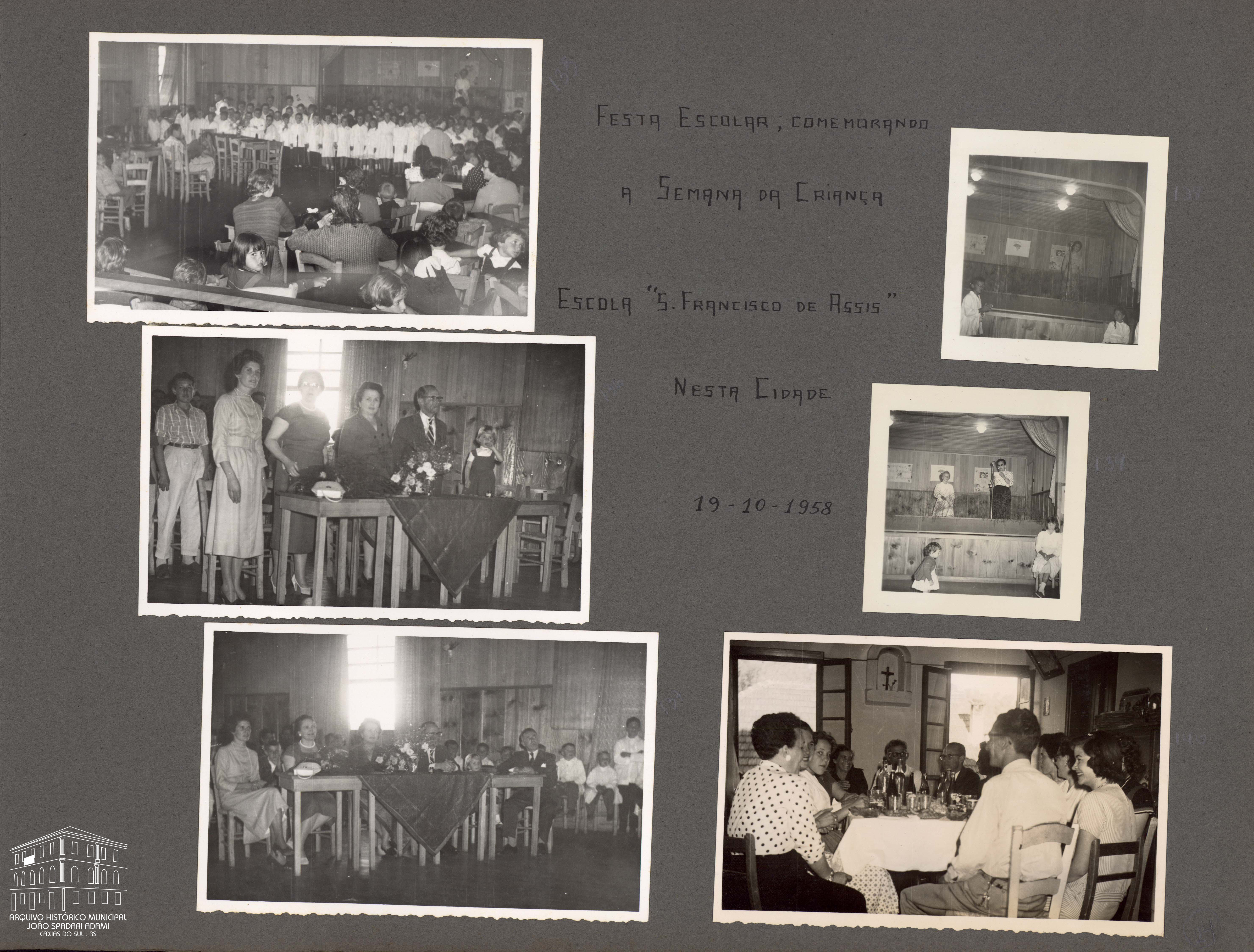 Foto 135: Crianças uniformizadas em apresentação para o público, sentado em cadeiras, nas comemorações da Semana da Criança na Escola São Francisco de Assis, em 19 de outubro de 1958.