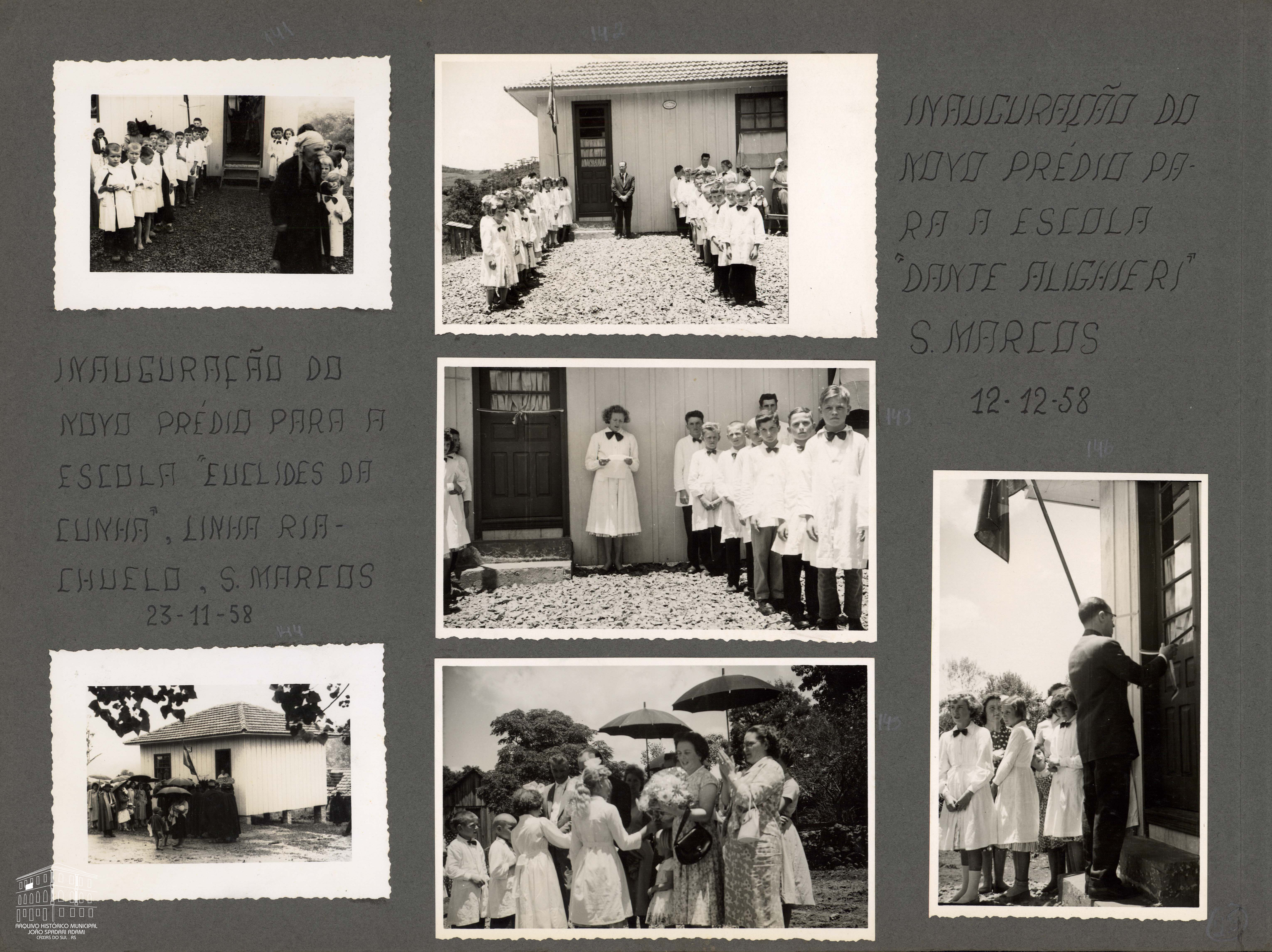 Foto 142: Ao centro, Prefeito Rubem Bento Alves e, nas laterais, alunos uniformizados e enfileirados na entrada do novo prédio para a Escola Dante Alighieri, situada na Linha Riachuelo, São Marcos, em 12 de dezembro de 1958.