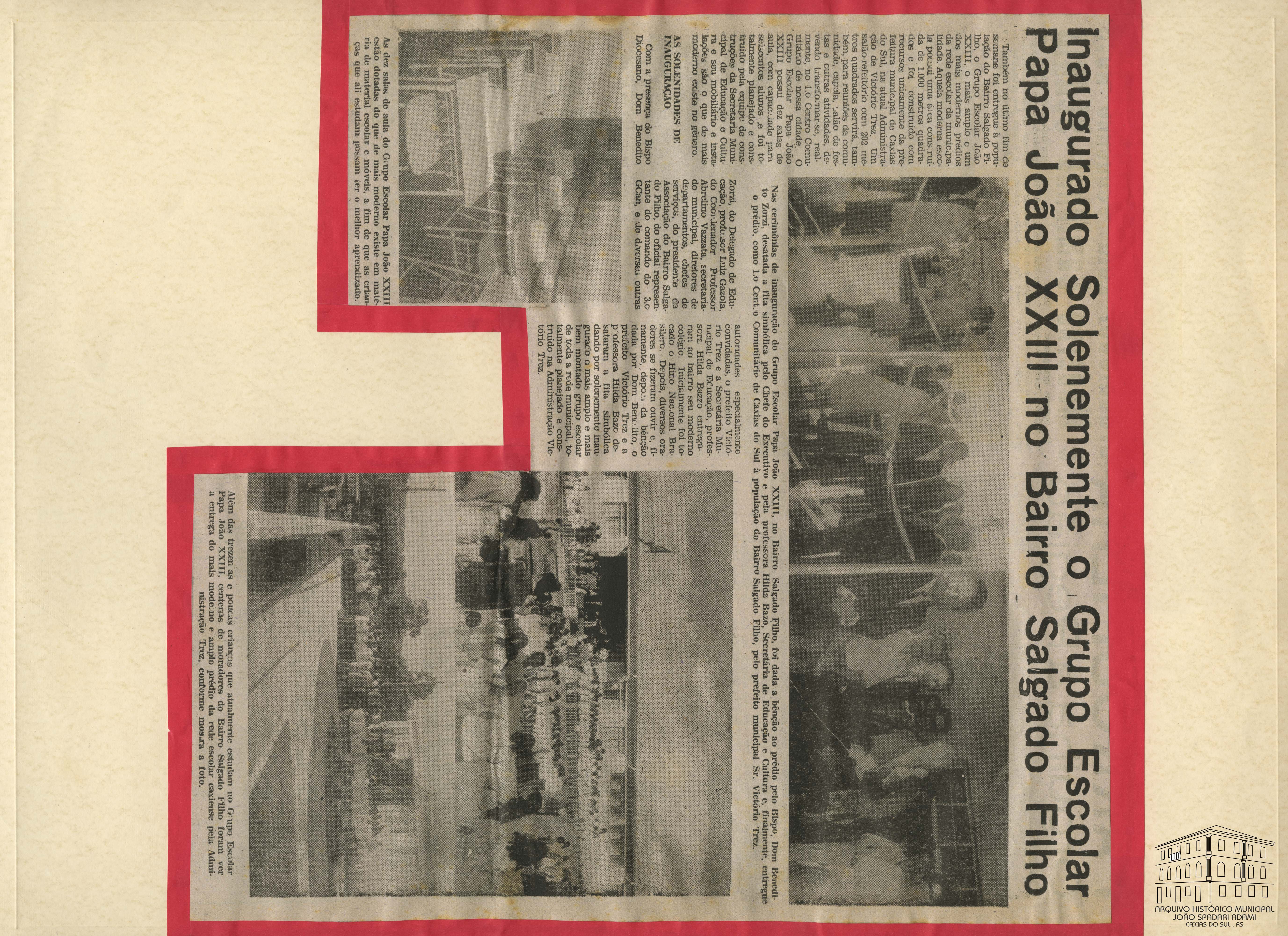 Recorte de jornal 69: Notícia sobre a inauguração do Grupo Escolar Papa João XXIII no Bairro Salgado Filho.