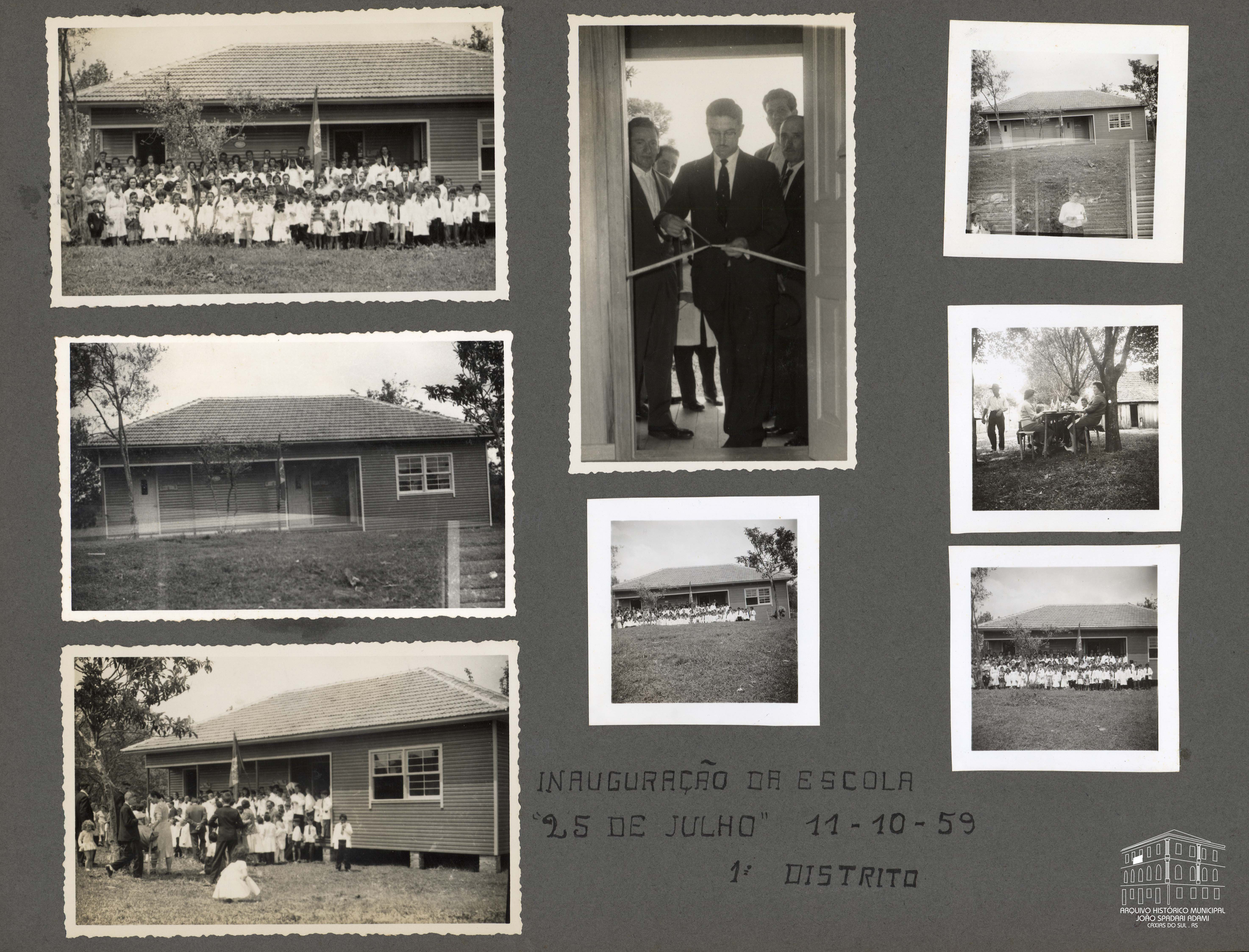 .Foto 182: Alunos uniformizados e pessoas na frente da Escola 25 de Julho, situada no Travessão Dom Pedro II - 7ª légua, 1º Distrito, em 11 de outubro de 1959, data da inauguração.