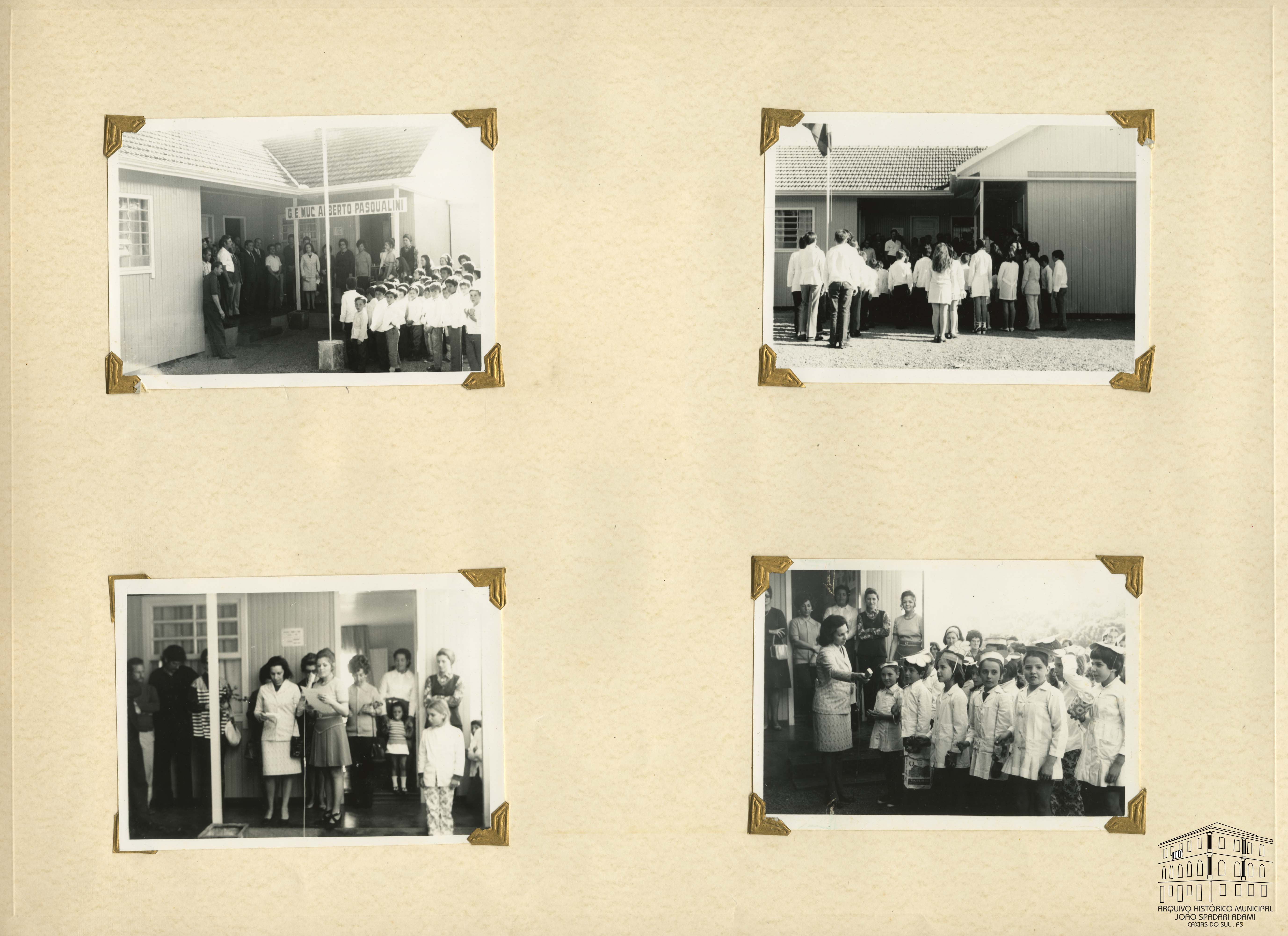Fotografia 83: Autoridades e comunidade escolar na frente do prédio novo do Grupo Escolar Municipal Alberto Pasqualini, na data da inauguração, em 30 de setembro de 1972.