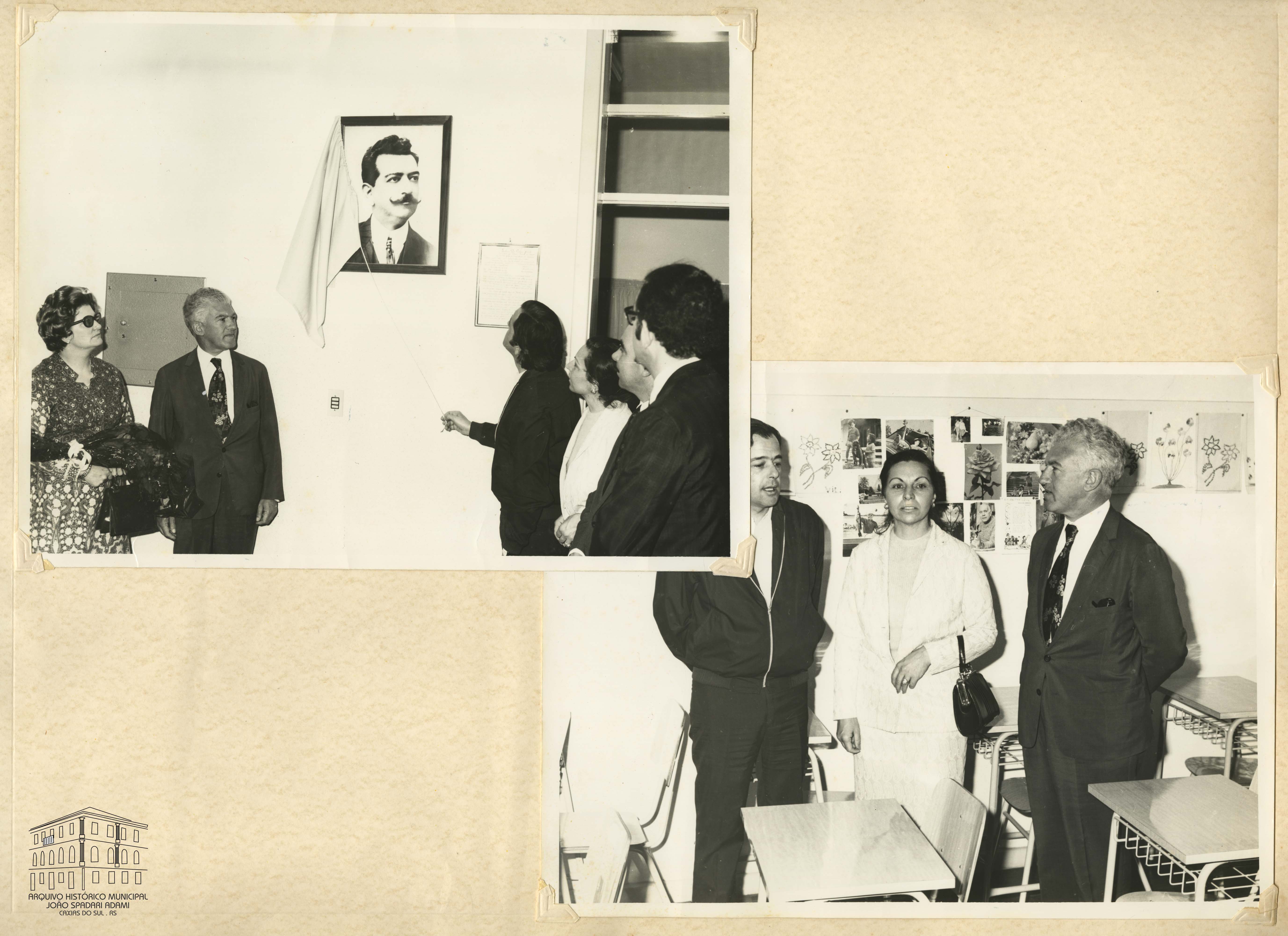 Fotografia 107: À esquerda, Arilde Trez e o Prefeito Victorio Trez, descerrando o quadro do patrono, seu neto, Francisco Caldas Júnior, representando a Companhia Jornalística Caldas Júnior, na inauguração do Grupo Escolar Municipal Caldas Júnior, situado no Bairro Petrópolis, em 24 de outubro de 1972.