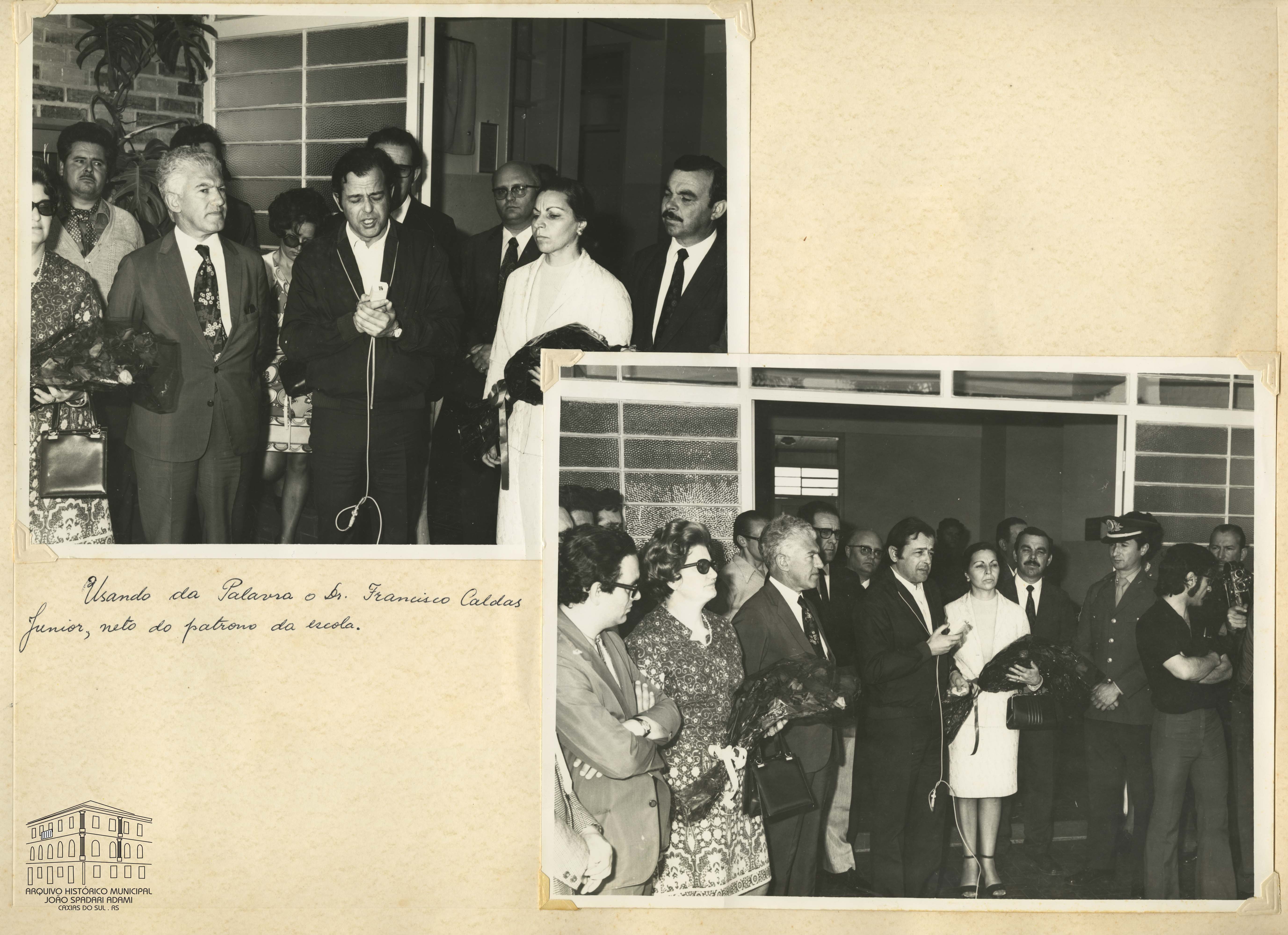 Fotografia 112: À esquerda, esposa do Prefeito, Sra Arilde Trez, ao seu lado, Prefeito Victorio Trez, ao microfone, Francisco Caldas Júnior, neto do patrono, representando a Companhia Jornalística Caldas Júnior, e, ao seu lado, Secretária Municipal da Educação e Cultura, Hilda Bazo, na inauguração do Grupo Escolar Municipal Caldas Júnior, situado no Bairro Petrópolis, em 24 de outubro de 1972.