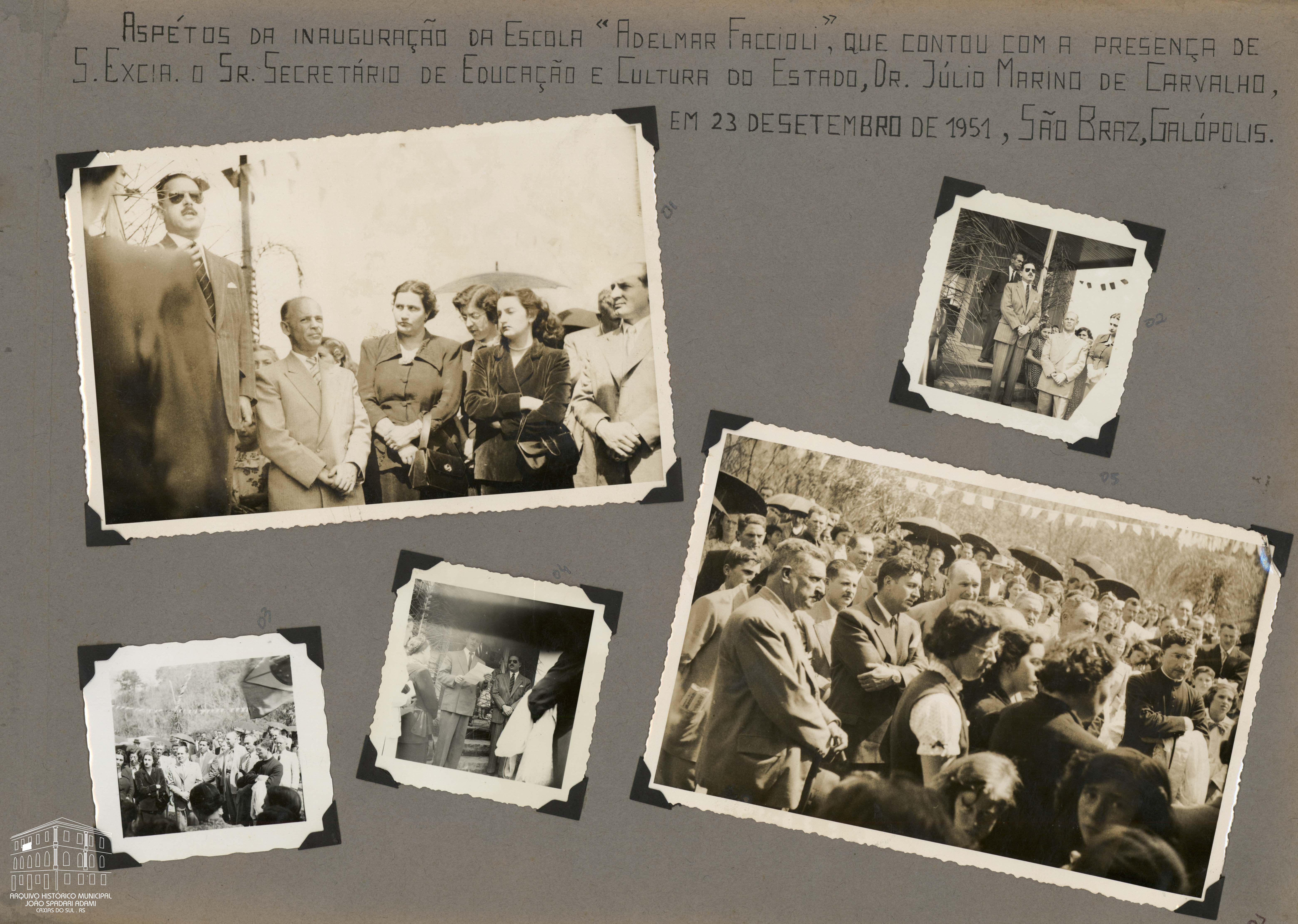 Foto 1: Secretário de Educação e Cultura do Estado, Dr. Júlio Marino de Carvalho (de óculos) e, ao seu lado, Prefeito Luciano Corsetti, em 23 de setembro de 1951, na inauguração da Escola Adelmar Faccioli, situada em São Braz, Galópolis.
