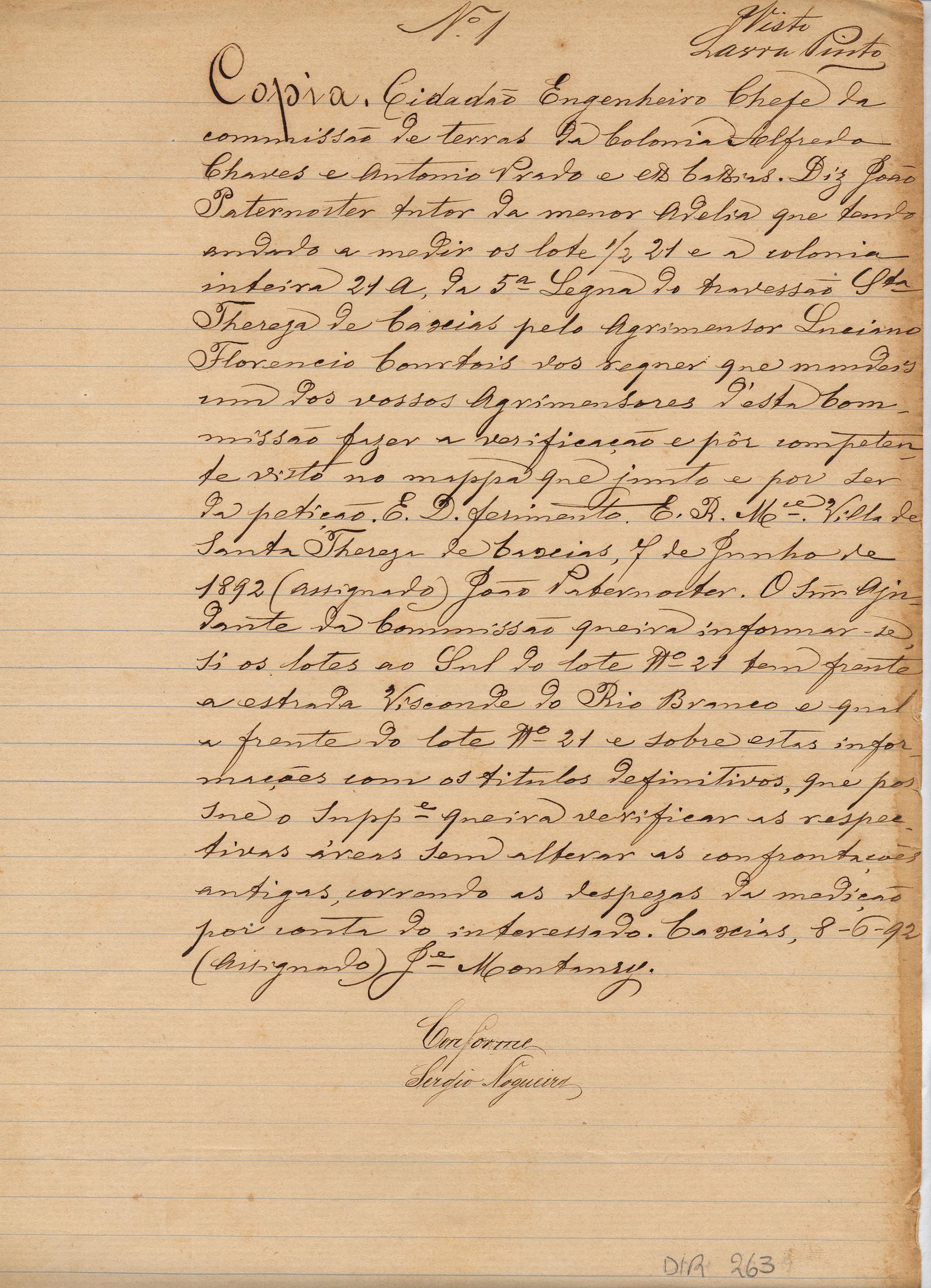 Cópia de Petição de João Paternoster, para o Engenheiro chefe da Comissão de Terras das colônias Alfredo Chaves, Antonio Prado e Caxias. Assunto: solicita a verificação medição do ½ lote nº 21 e da colônia inteira 21A, da 5ª légua do travessão Santa Tereza. Local: Alfredo Chaves, Caxias e Antônio Prado.