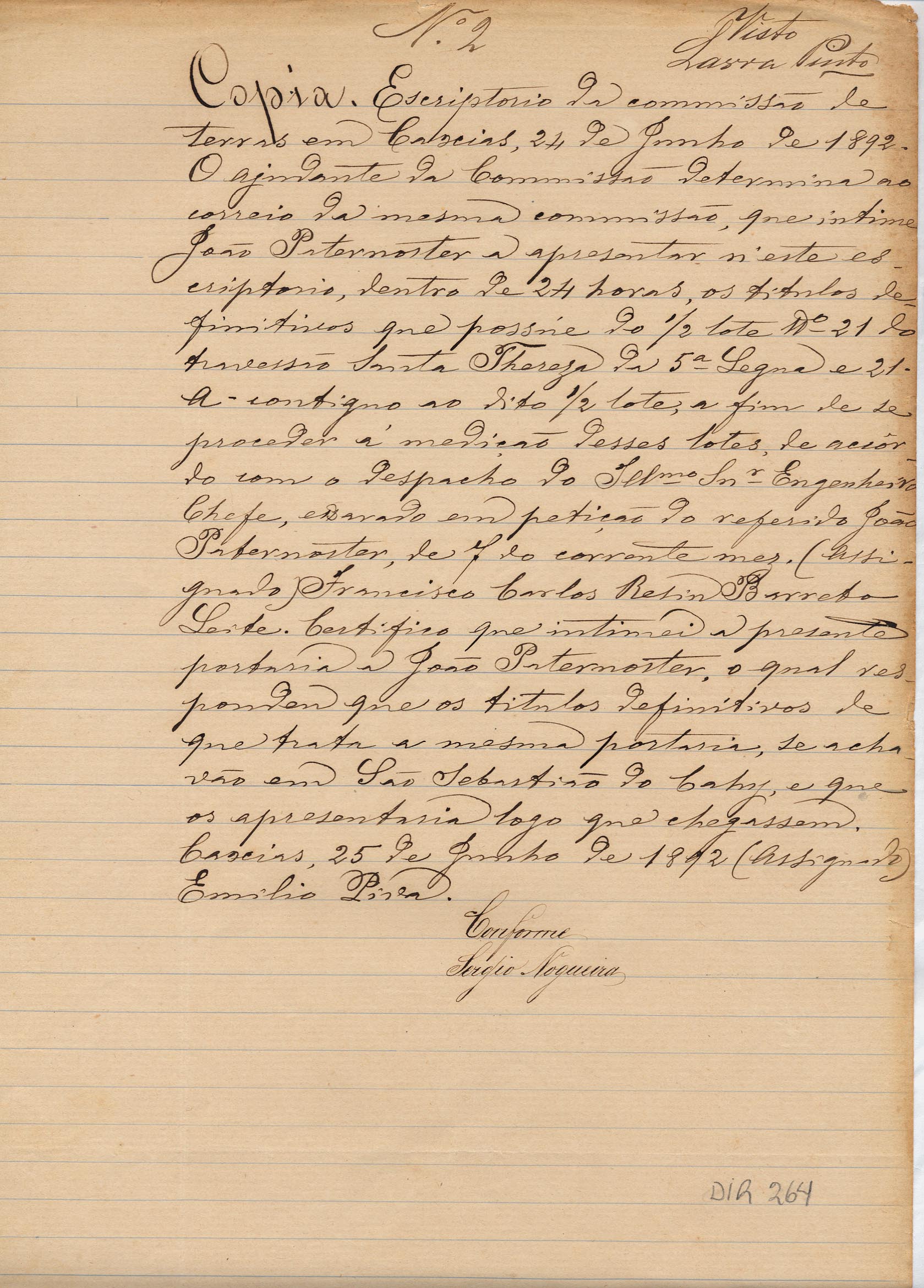 Cópia da petição de Francisco Carlos Resin Barreto Leite - Ajudante da Comissão de Terras em Caxias, para João Paternoster. Assunto: intimação para que João Paternoster compareça no Escritório da Comissão de terras em Caxias, apresentando os títulos definitivos que possui do ½ lote nº 21 e 21A, do travessão Santa Tereza da 5ª légua. Local: Caxias.