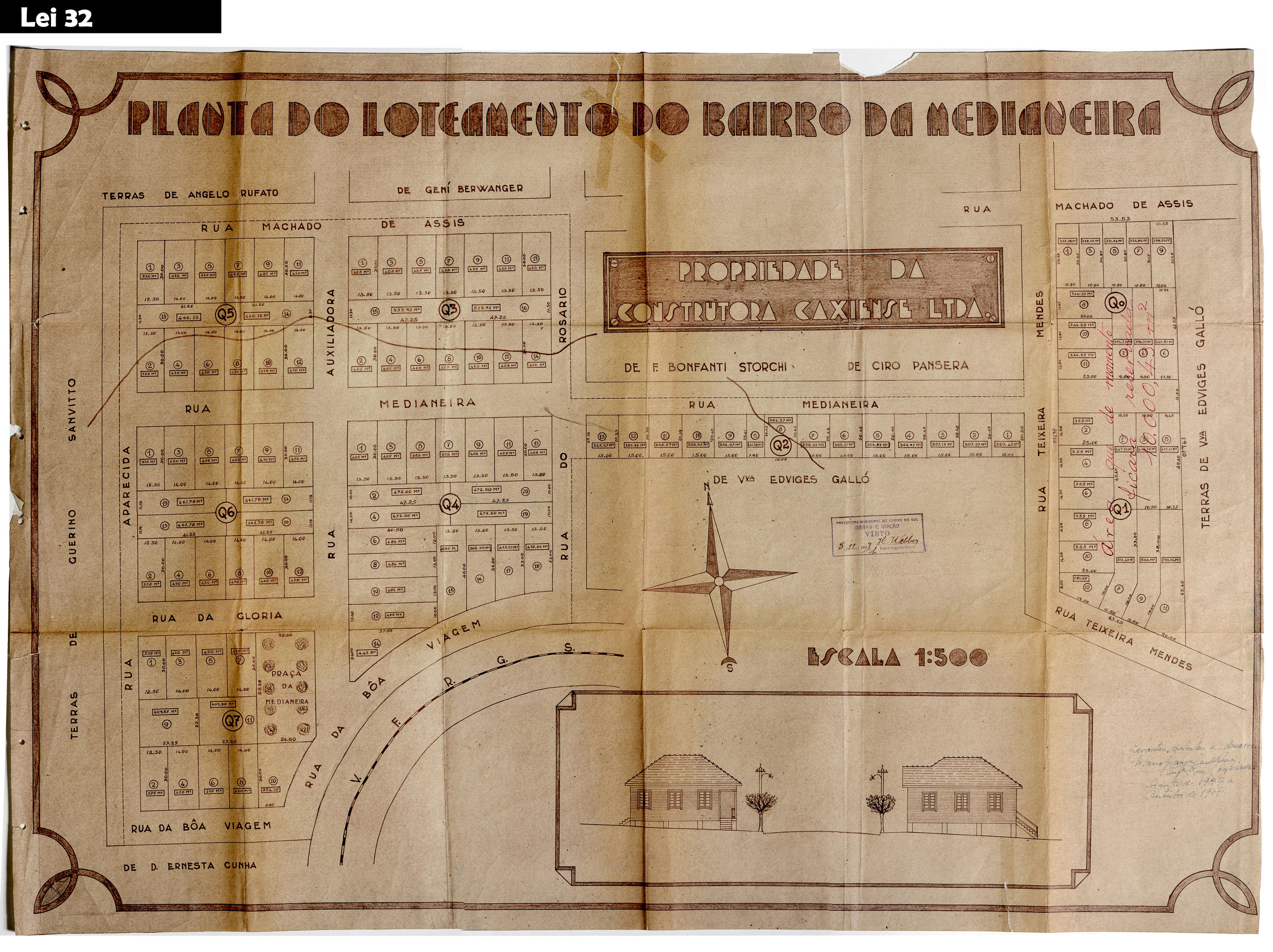 Nesta mesma série, Plantas de Loteamentos, o Item 23_1947 - Projeto de Loteamento do Bairro Medianeira, contém planta igual, com anotações diferentes