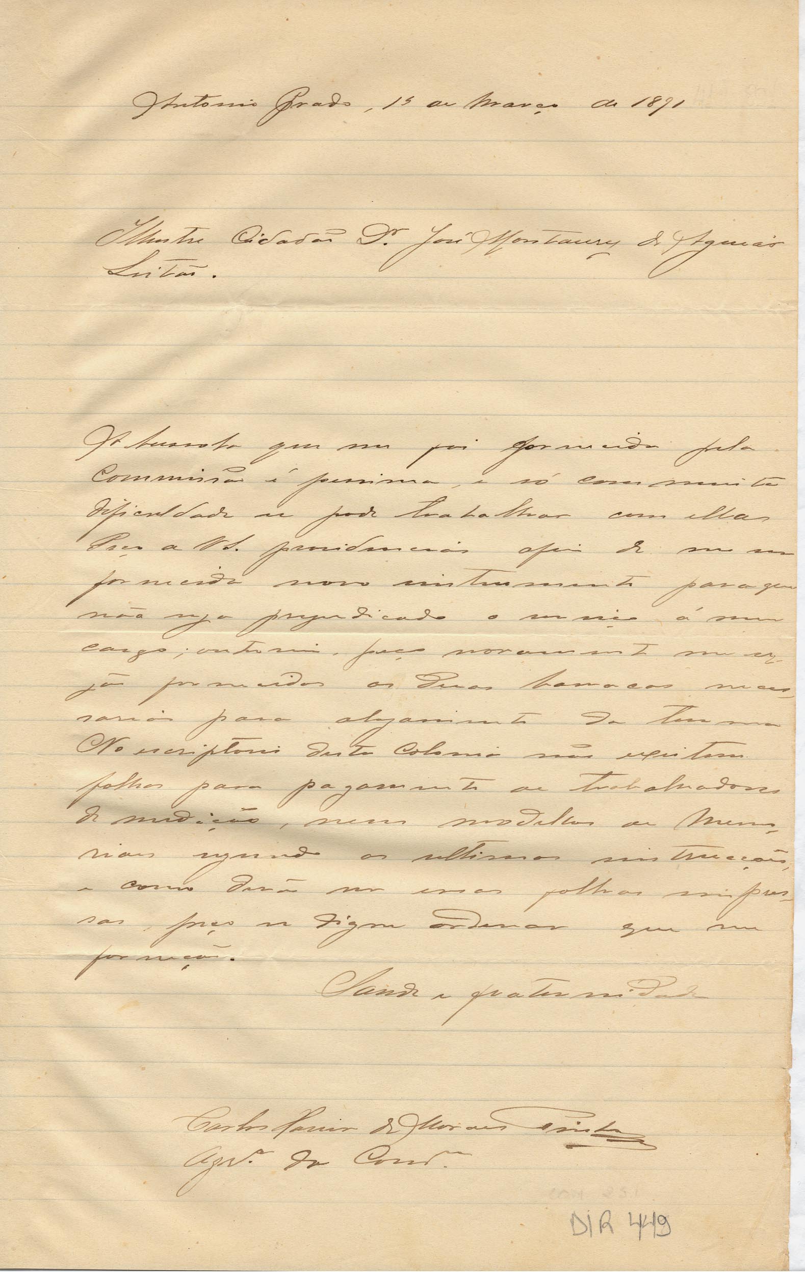 De Carlos Xavier de Morais Pinto - Agrimensor da Comissão em Antonio Prado, para o Dr. José Montaury Aguiar Leitão - Engenheiro - chefe. Assunto: informa que os instrumentos enviados para os trabalhos são de péssima qualidade, dificultando os serviços; solicita barracas, folhas de pagamento e modelos de memoriais.
