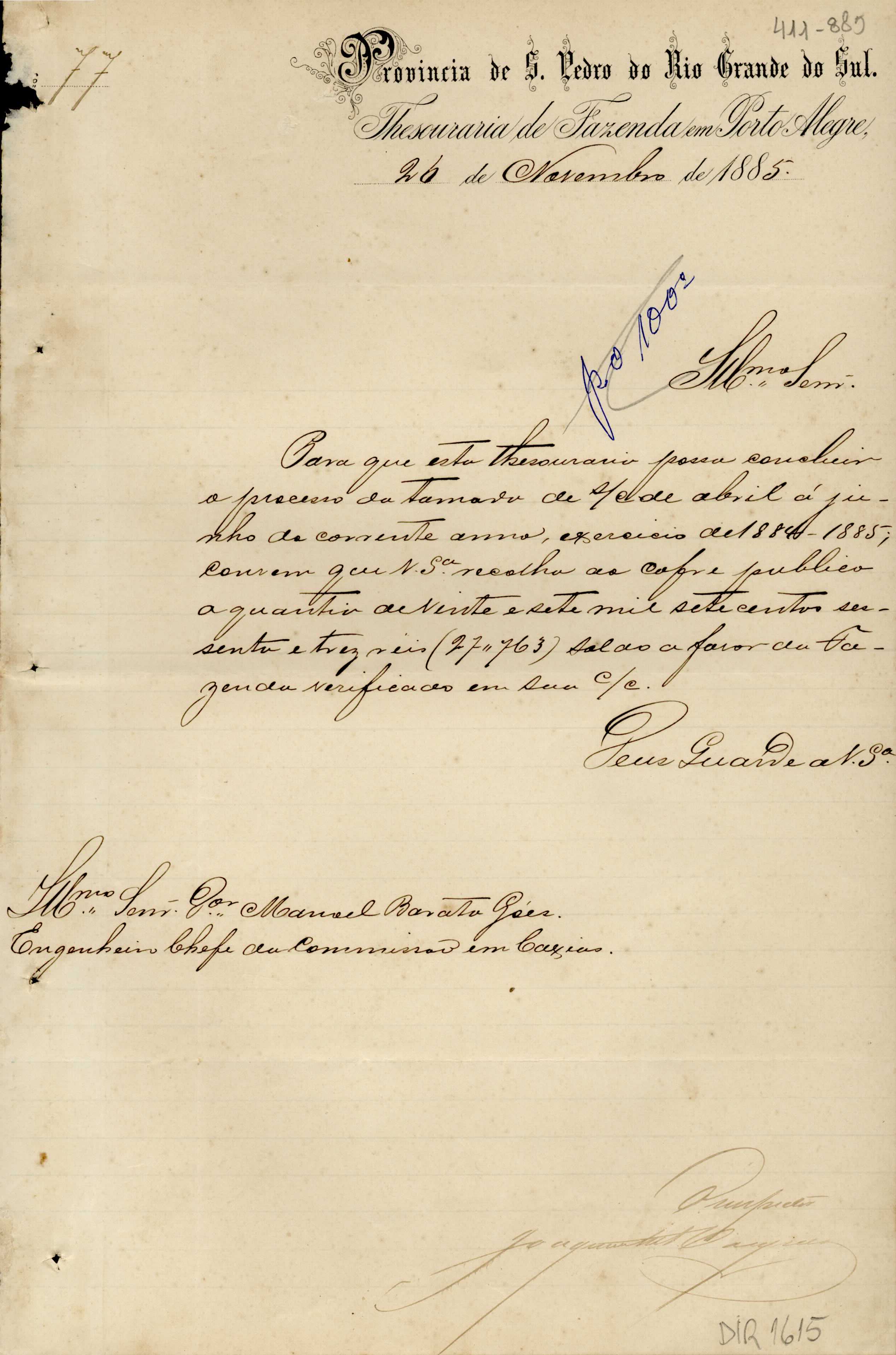 De Joaquim Antonio Vasques - Inspetor da Tesouraria de Fazenda em Porto Alegre, para Manoel Barata Góes - Chefe da Comissão de Lotes em Caxias. Assunto: solicita recolhimento de verbas.
