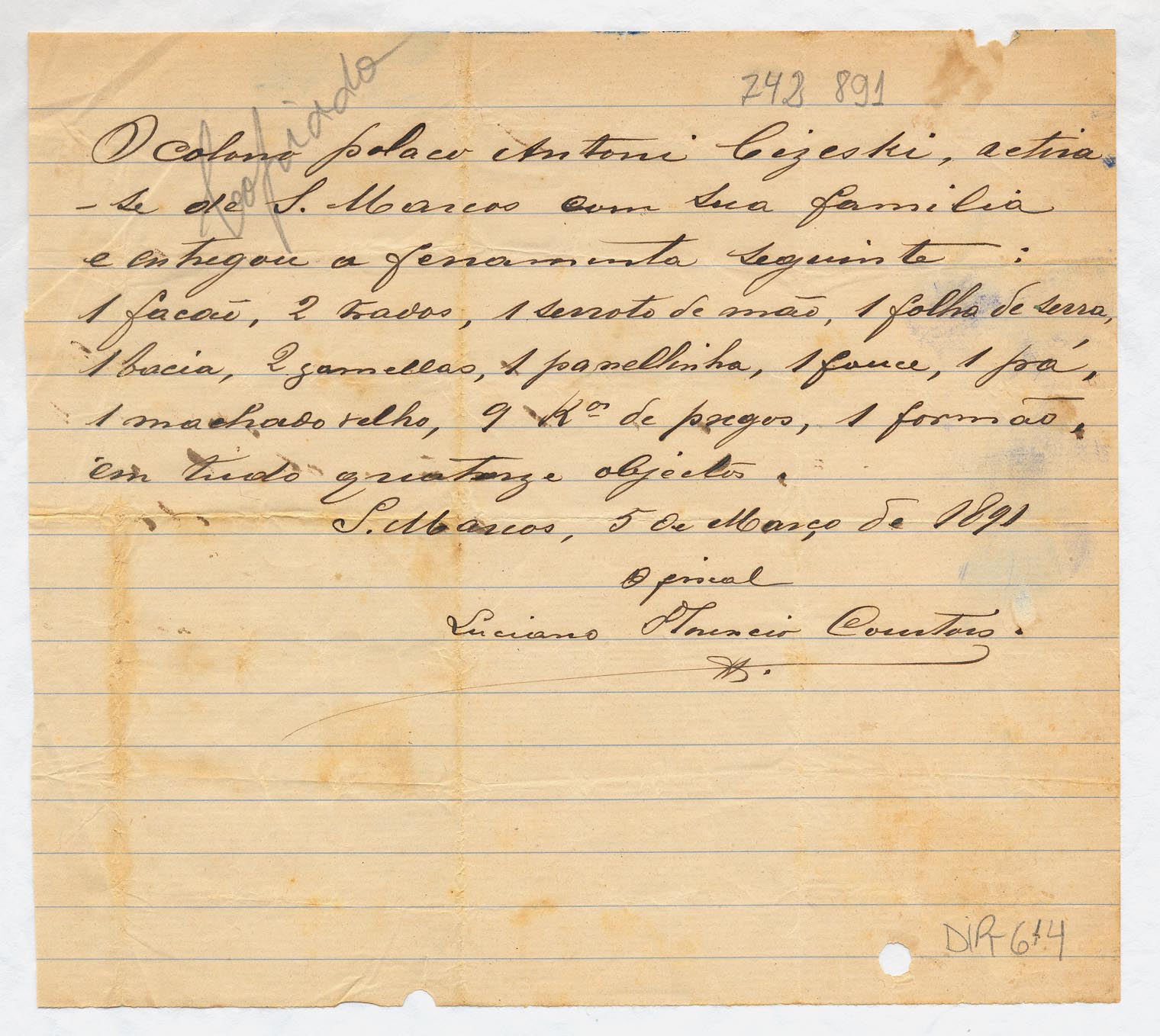 De Luciano Florencio Courtois - Fiscal de Serviços da Comissão em São Marcos. Assunto: comunica retirada do colono polonês Antoni Cizeski, e ferramentas que entrega.
