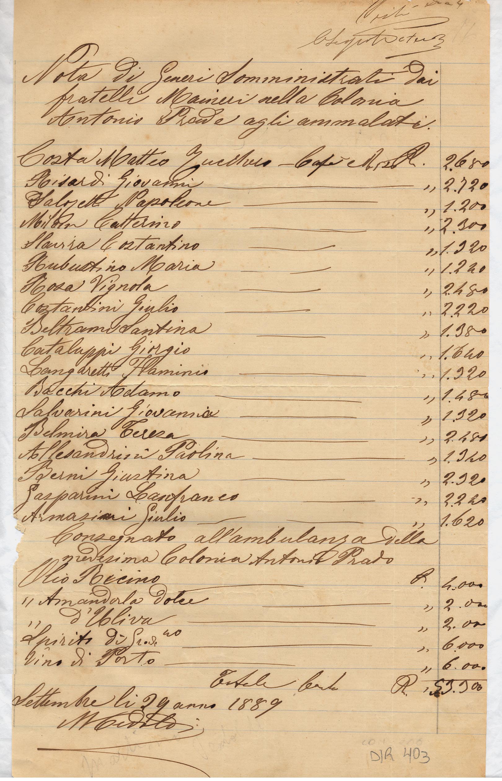 De Martino Tedoldi - Caxias. Assunto: relação de objetos fornecidos aos imigrantes doentes da Colônia de Antônio Prado.