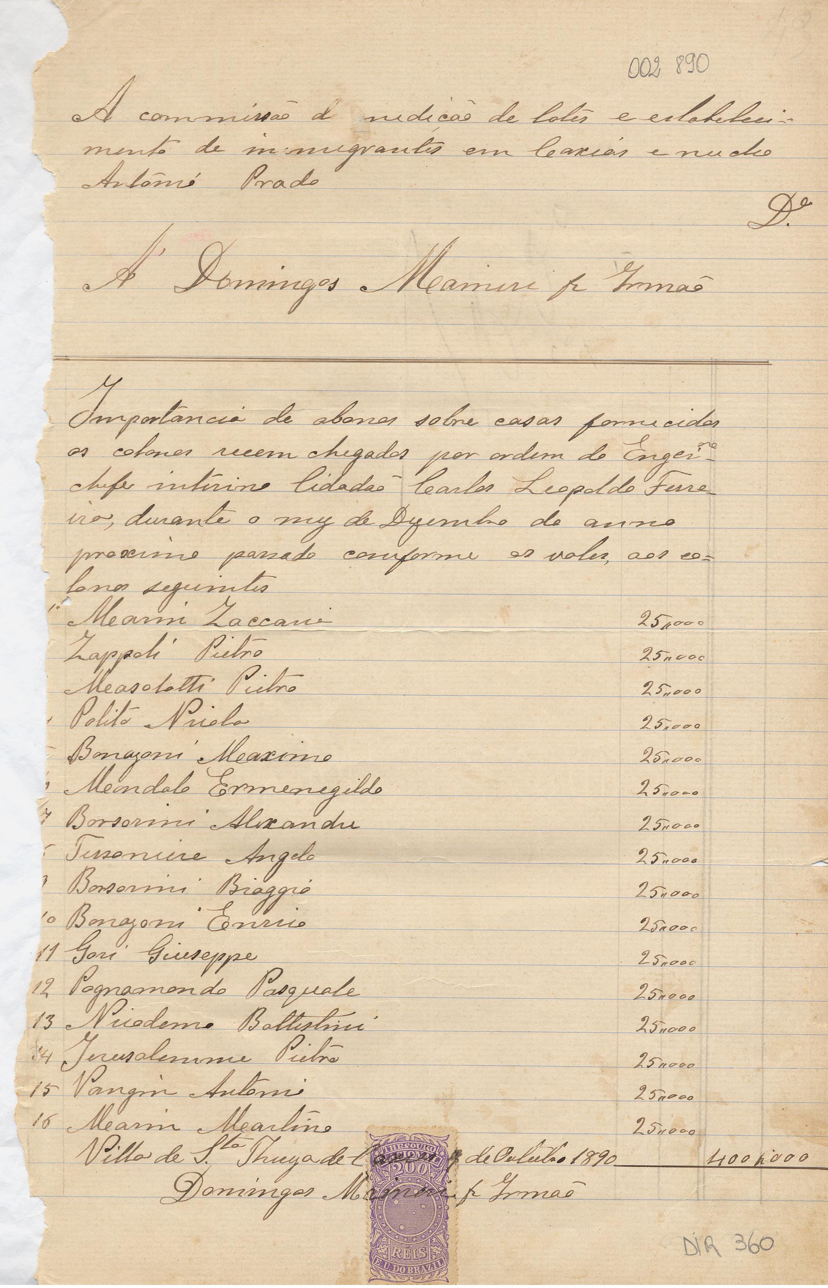 De Carlos Leopoldo Ferreira - Engenheiro Chefe interino da Comissão de Terras em Caxias e Antônio Prado, para Domingos Maineri e Irmão. Assunto: relação dos colonos e do valor do abono que receberam sobre casas, fornecidos aos recém-chegados. Local: Caxias e Antonio Prado.