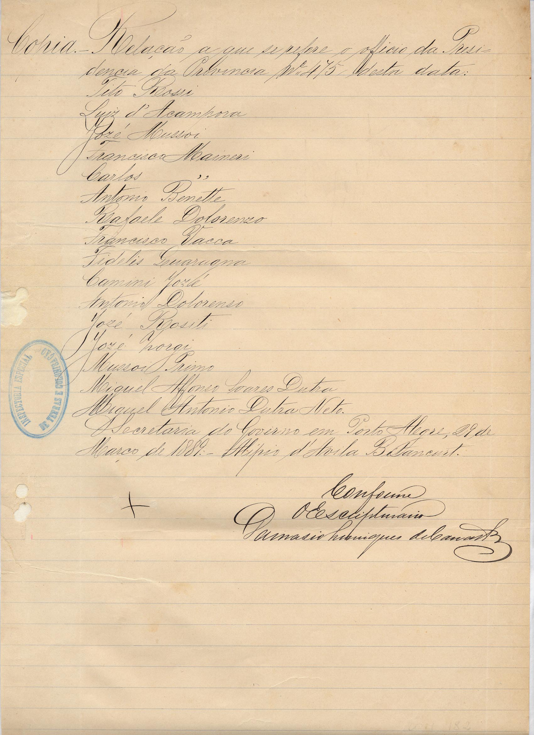 Secretaria do Governo da Província do RS em Porto Alegre - Alípio d'Ávila Bitencurt. Assunto: relação de imigrantes, conforme solicitação do ofício da Presidência da Província. Local: Porto Alegre.