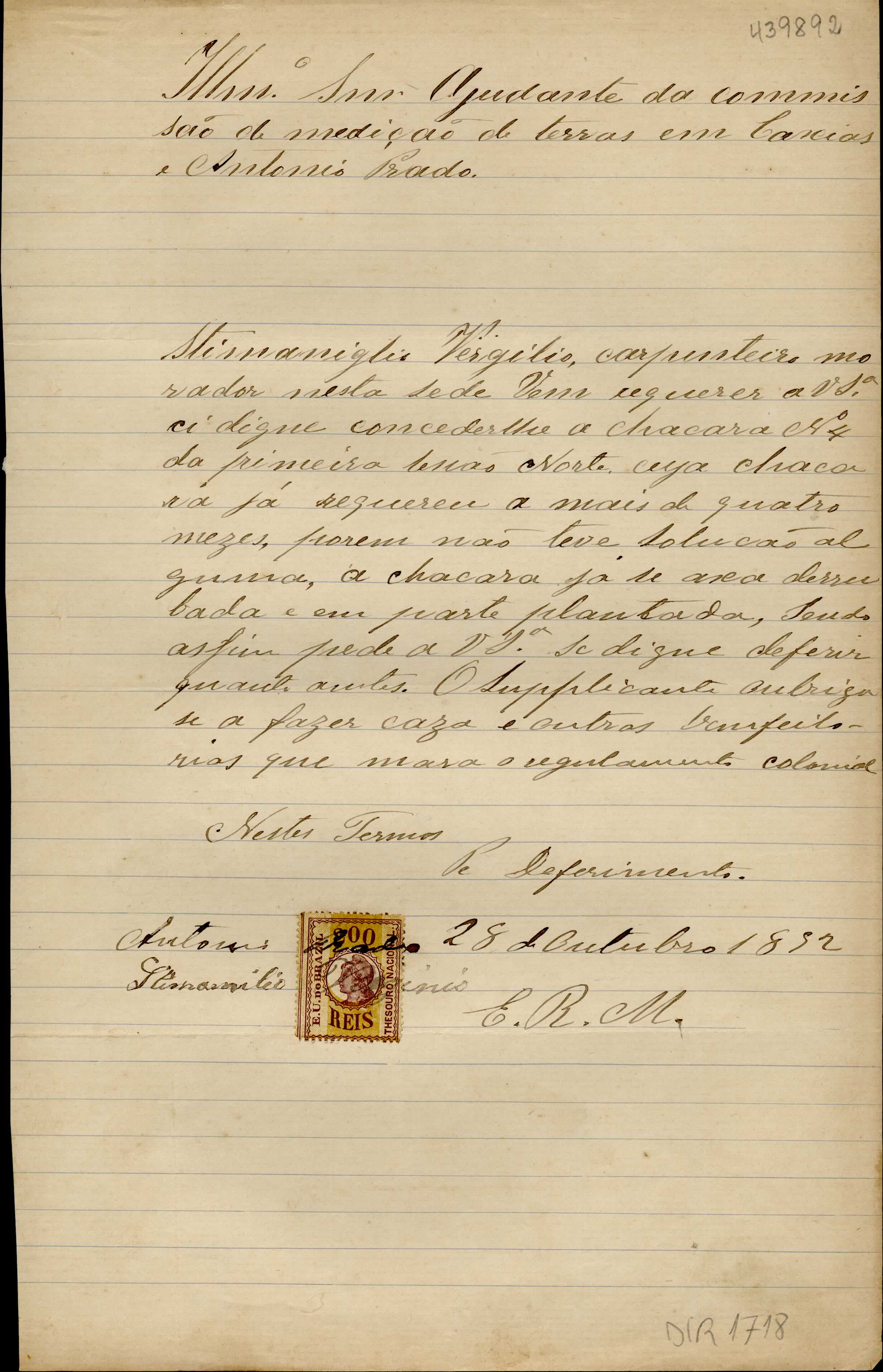 De Vergílio Stimamigli - carpinteiro, Antonio Prado, para o Ajudante da Comissão de Medição de Terras em Caxias e Antonio Prado. Assunto: requer a concessão da chácara nº 4, da primeira terra Norte. Local : Antonio Prado