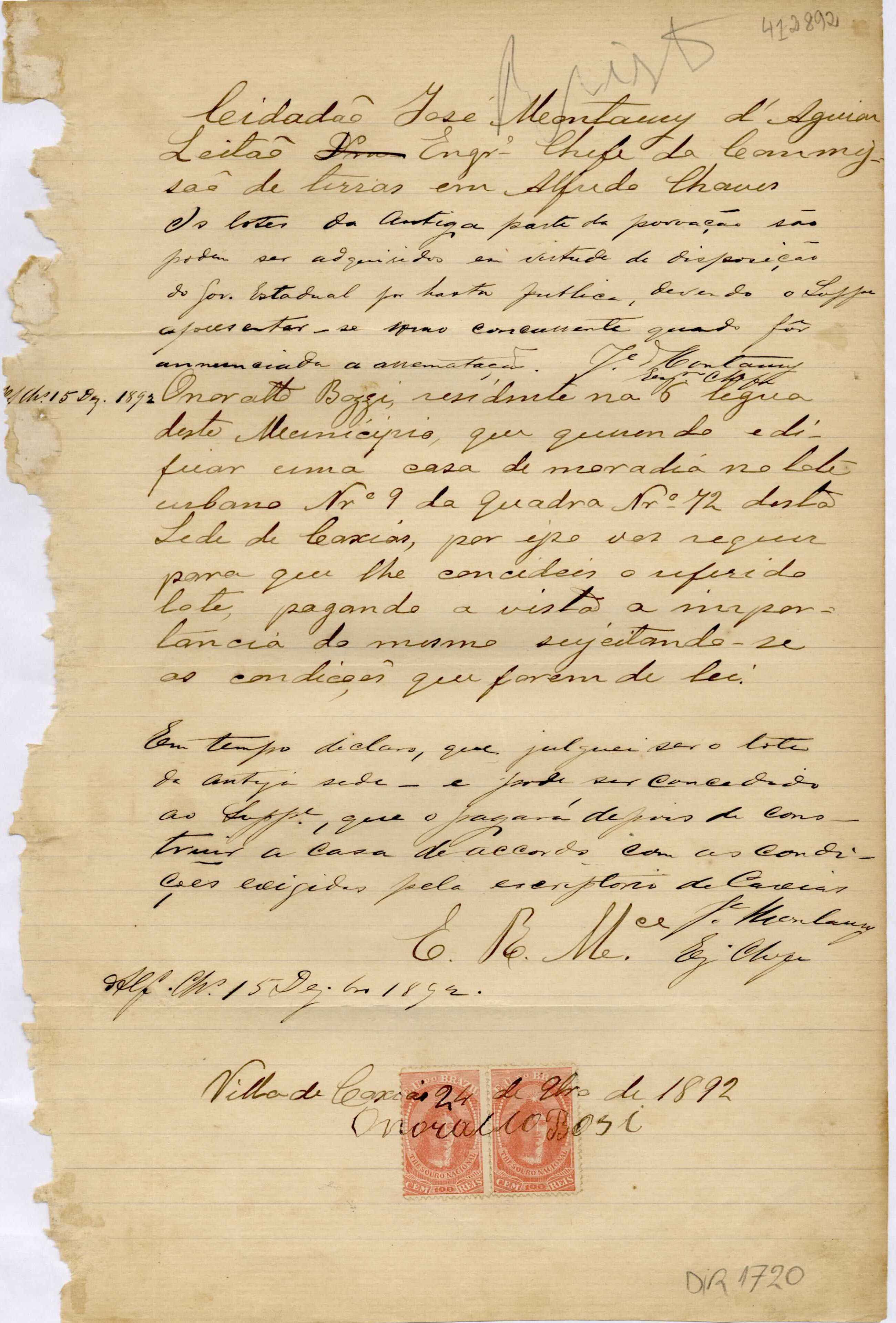 De Onoratto Bosi - residente na 6ª légua em Caxias, para José Montaury - Engenheiro Chefe da Comissão de Terras em Alfredo Chaves. Assunto: requer a concessão do lote urbano nº 9, quadra nº 72 em Caxias. Local: Caxias