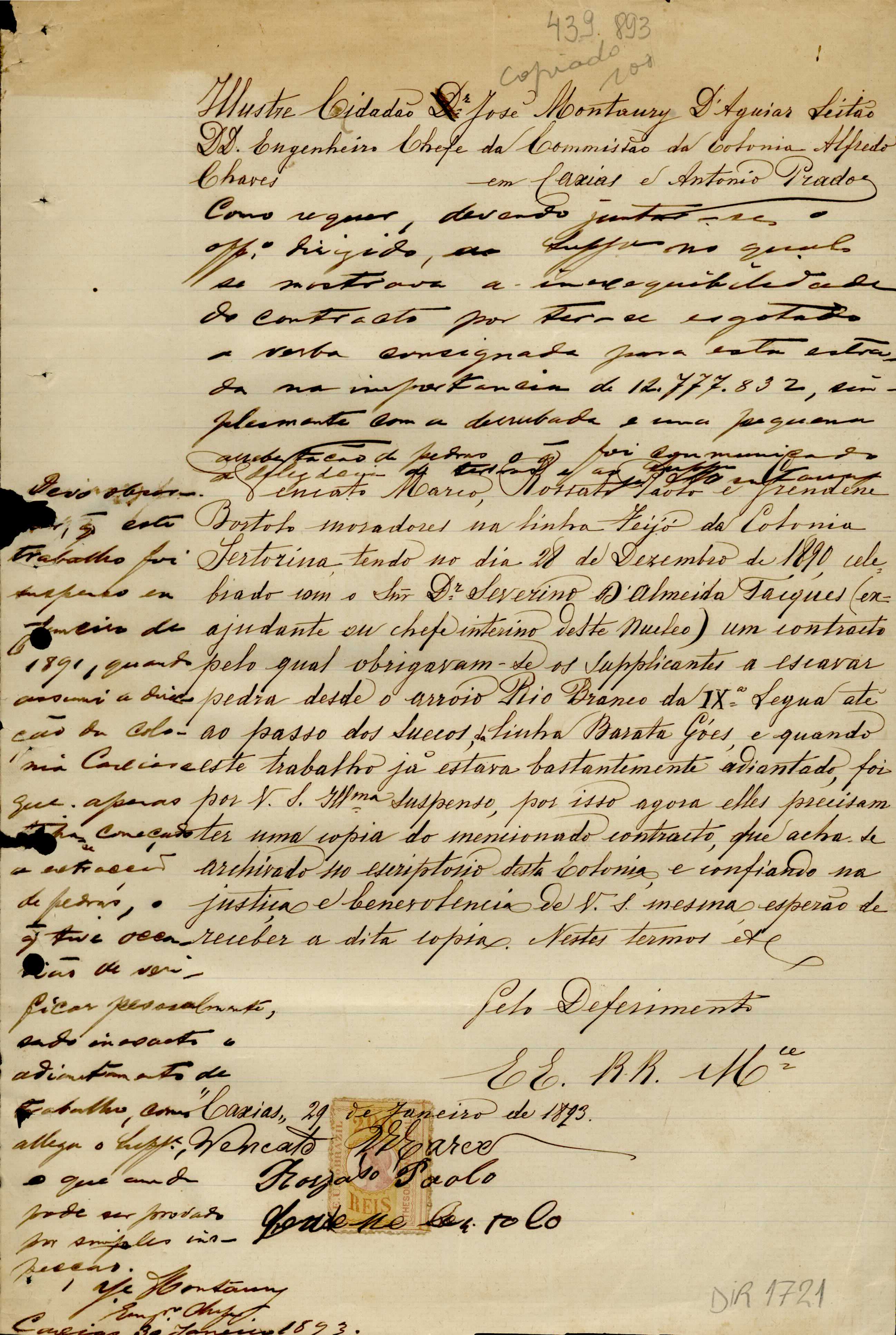 De Vencato Marco, Rossato Paolo e Grendene Bortolo - moradores da colônia Sertorina, Caxias, para José Montaury d'Aguiar Leitão - Engenheiro Chefe da Comissão da colônia Alfredo Chaves em Caxias e Antonio Prado. Assunto: solicitam cópia do contrato celebrado com o Dr. Severino d'Almeida Tarques, para escavar pedra. Local: Caxias