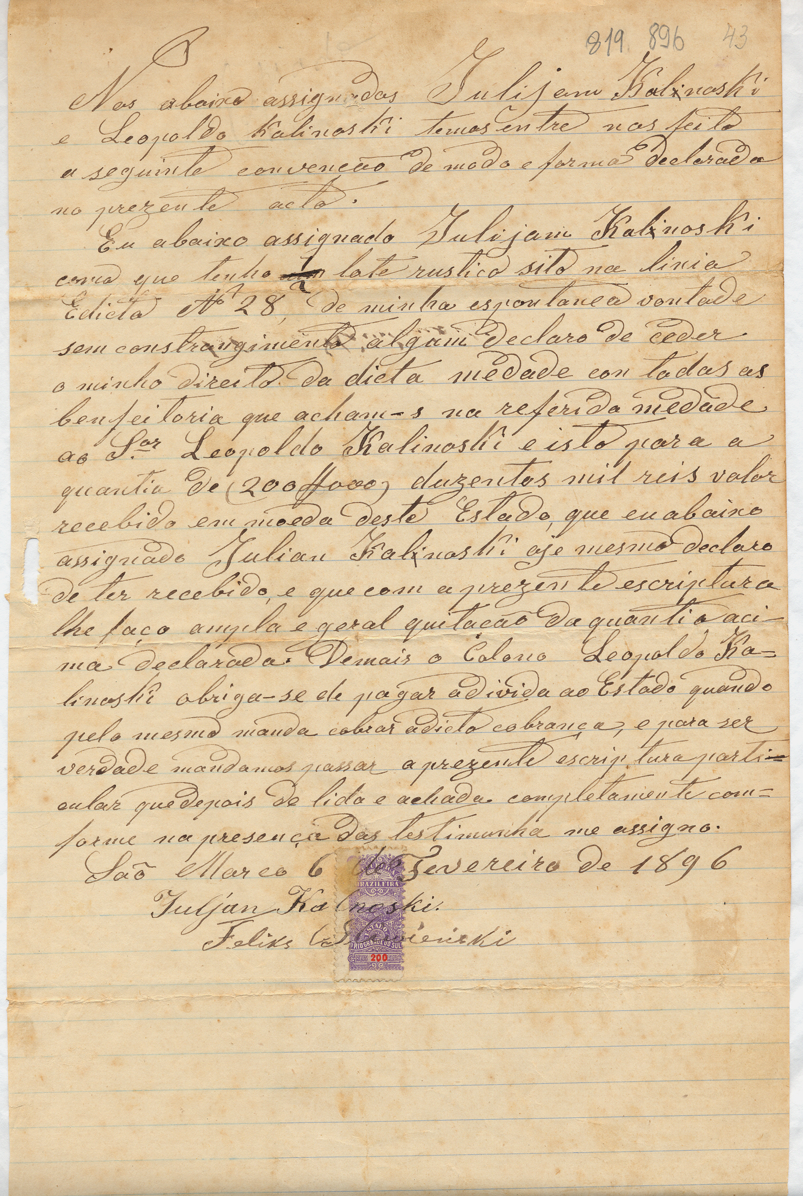 De Lulijam Kalnoski e Leopoldo Kalinoski - São Marcos. Assunto: declaração da cedência de ½ lote rústico, na linha Edita, nº 28, para Leopoldo Kalinoski. (ver série Escritório da Comissão de Terras em São Marcos - pag. 72). Local : São Marcos