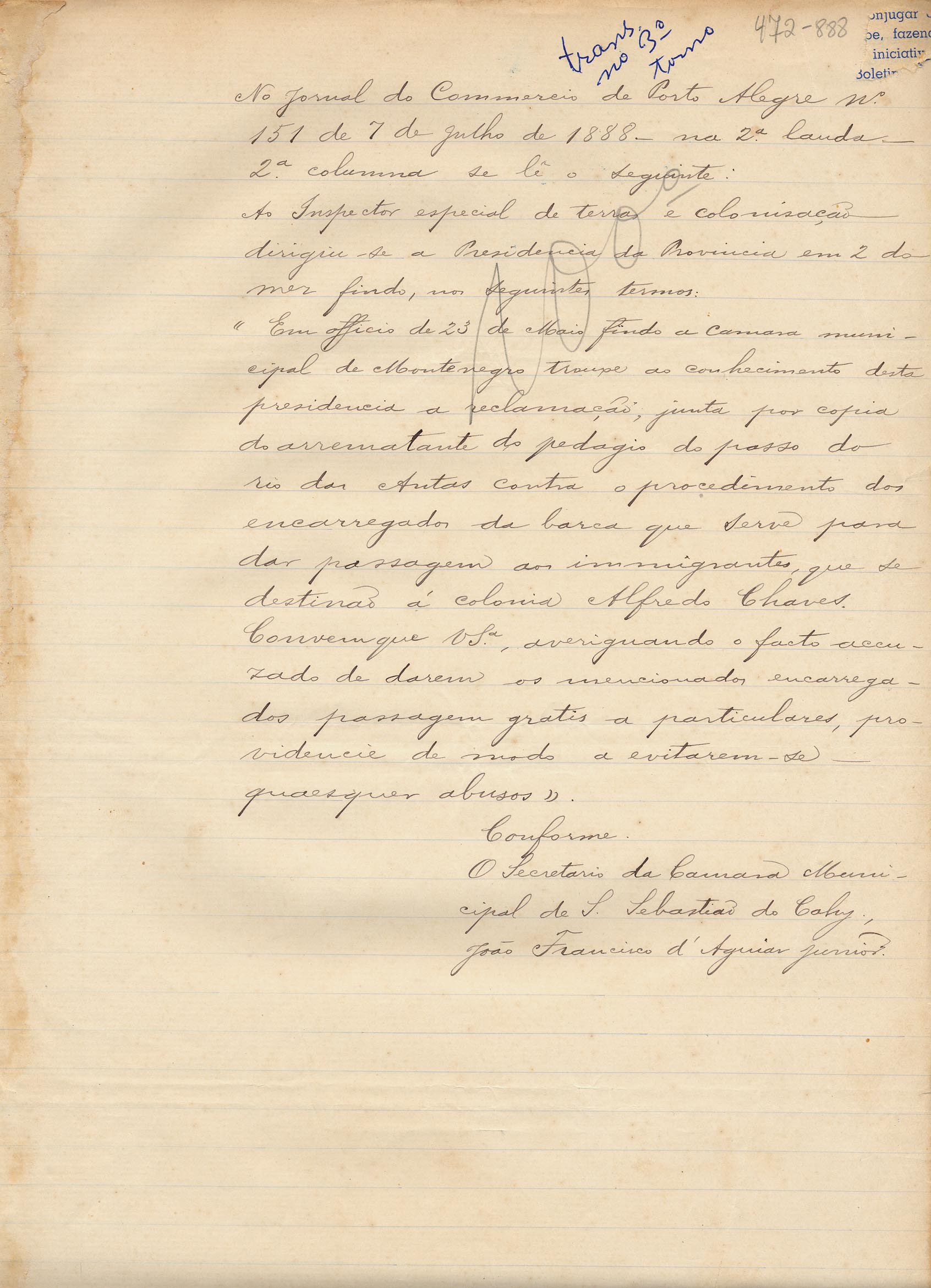 De João Francisco D'Aguiar Jr. - Secretário da Câmara Municipal de São Sebastião do Caí. Assunto: publicação no Jornal do Comércio de Porto Alegre, nº 151 de 7 de Julho de 1888, sobre a reclamação de irregularidades na cobrança do pedágio no passo do rio das Antas. Local: São Sebastião do Caí.
