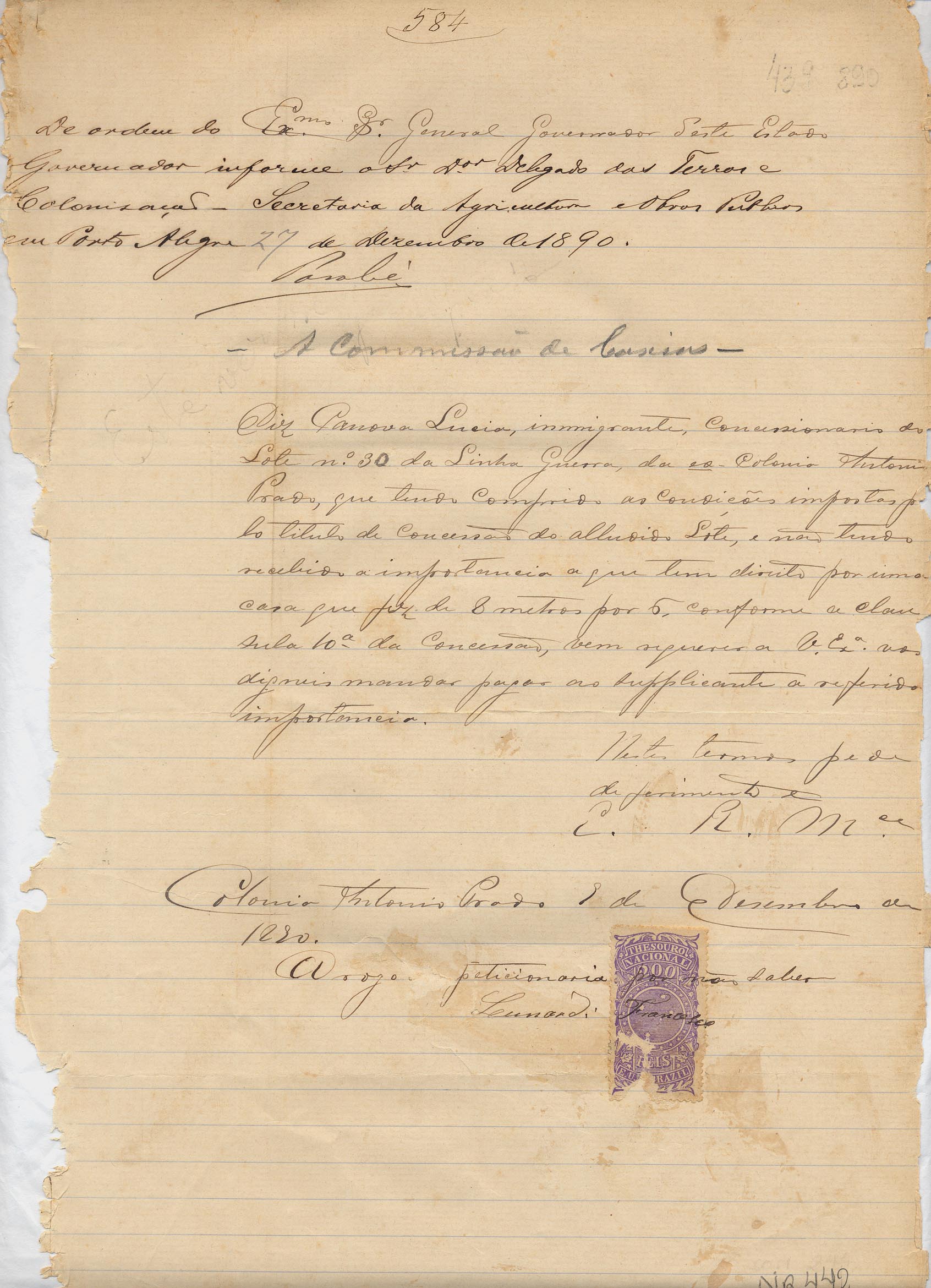 De Lunardi Francesco, solicitado pela peticionaria Panova Lúcia - Antônio Prado ao Governador do Estado. Assunto: requer a importância que tem direito pela construção de uma casa no lote n.º 30 da Linha Guerra, tendo cumprido as condições impostas pelo título de concessão.