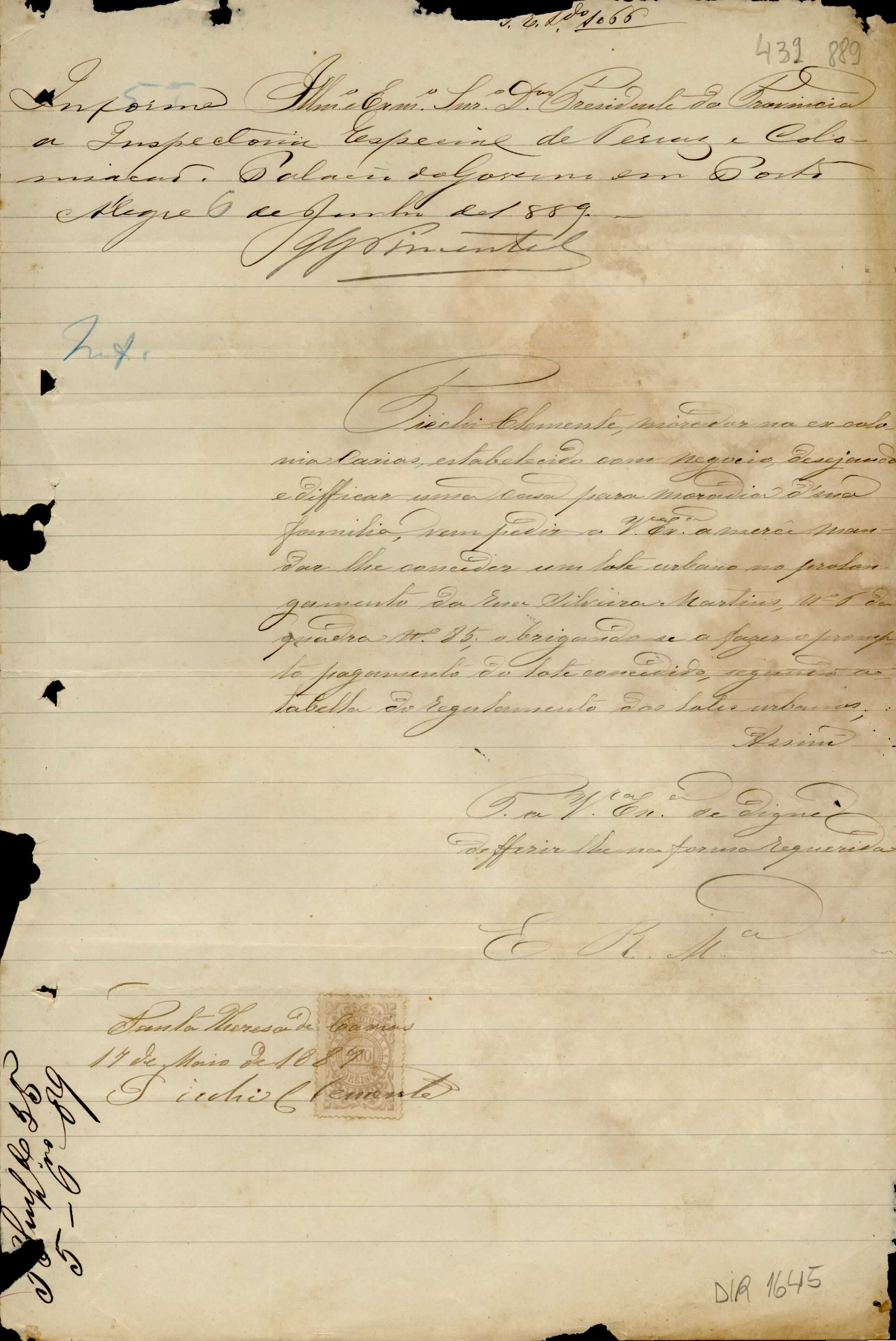 De Piechi Clemente - morador em Santa Tereza de Caxias, para o Presidente da Província do Rio Grande do Sul - Porto Alegre. Assunto: solicita concessão do lote urbano nº 6, quadra nº 85 na rua Silveira Martins. Local: Santa Tereza de Caxias