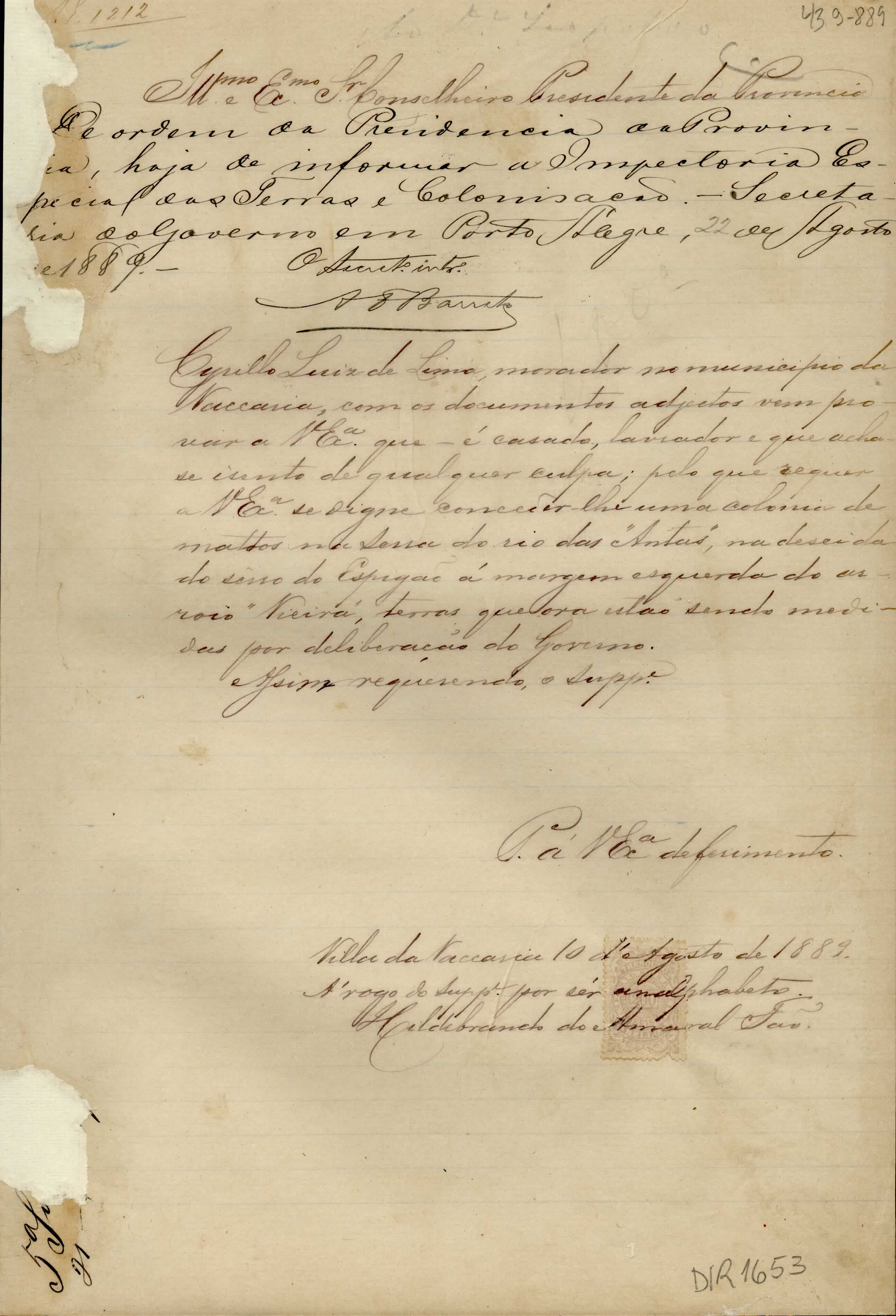 De Cyrillo Luiz de Lima - morador em Vacaria, para o Conselheiro Presidente da Província - Porto Alegre. Assunto: requer a concessão de uma colônia de matos na serra do rio das Antas. Local: Vacaria