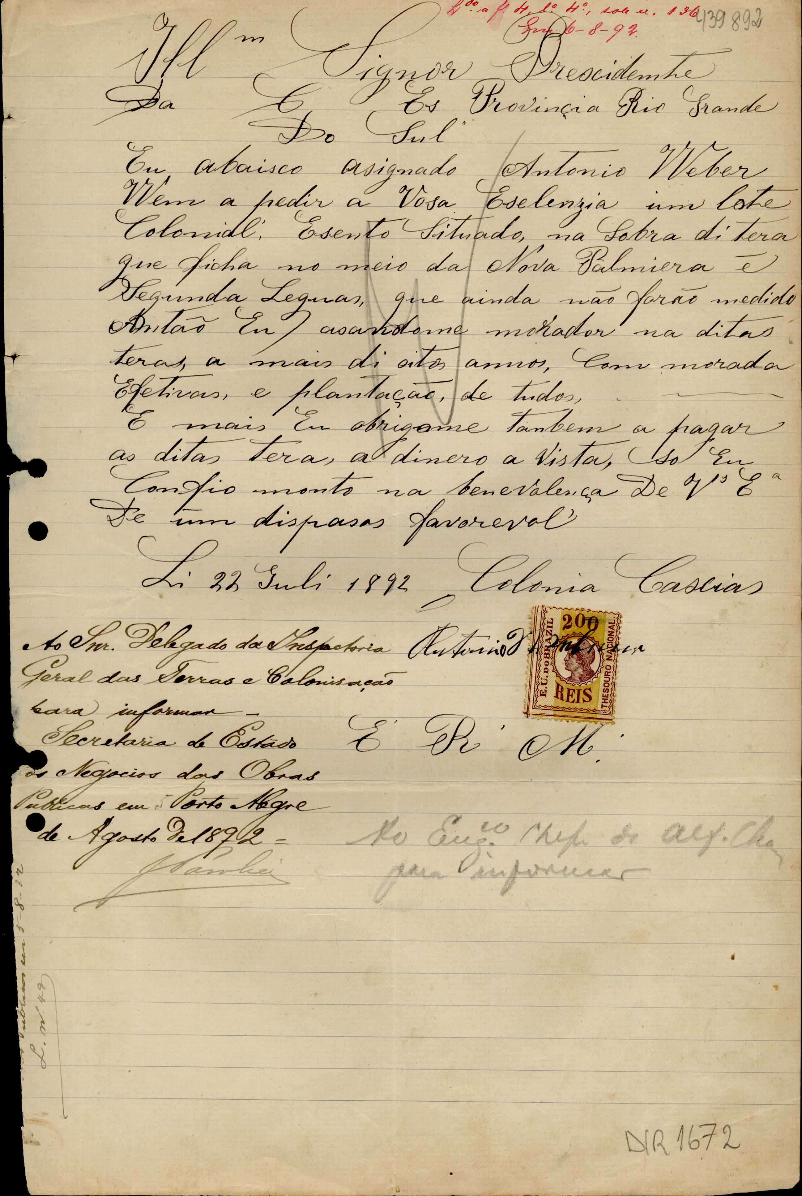 De Antonio Weber - Caxias, para o Presidente da Província do Rio Grande do Sul - Porto Alegre. Assunto: requer um lote colonial da sobra de terras em Nova Palmira. Local: Caxias