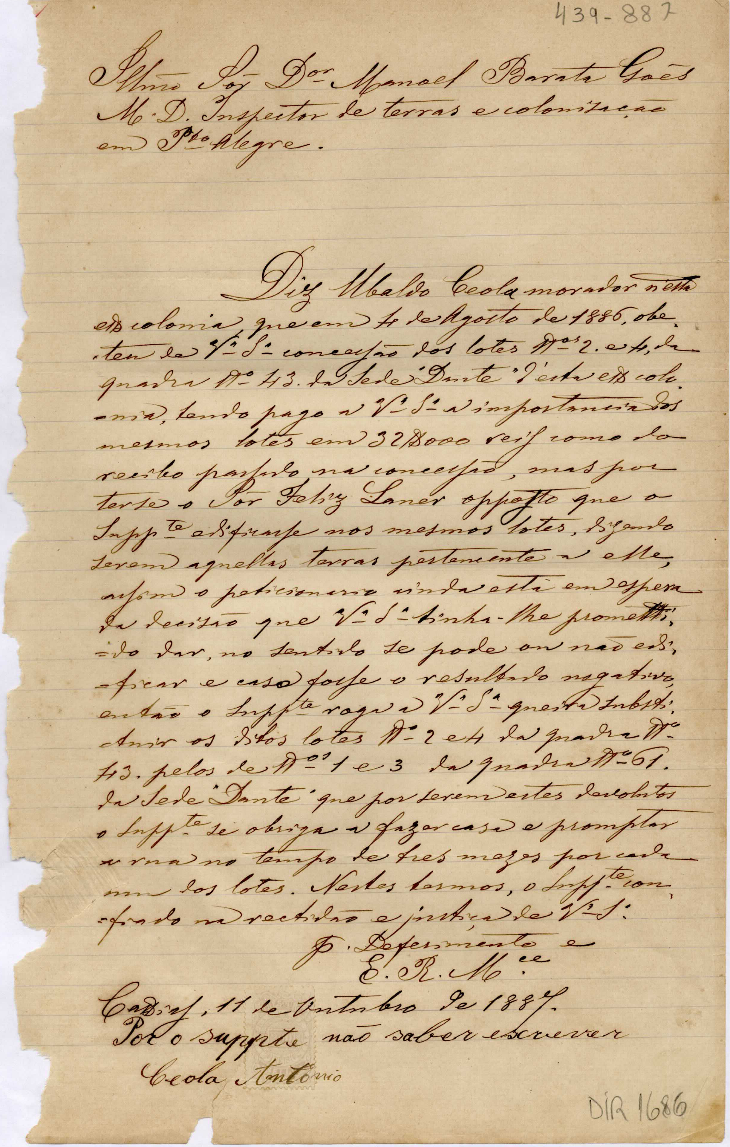 De Ubaldo Ceola - morador em Caxias, para Manoel Barata Góes - Inspetor de Terras e Colonização em Porto Alegre. Assunto: solicita a substituição dos lotes nos 2 e 4, quadra nº 43 (que diz pertencerem a Feliz Laner), pelos nos 1 e 3, quadra nº 61, que são devolutos. Local: Caxias