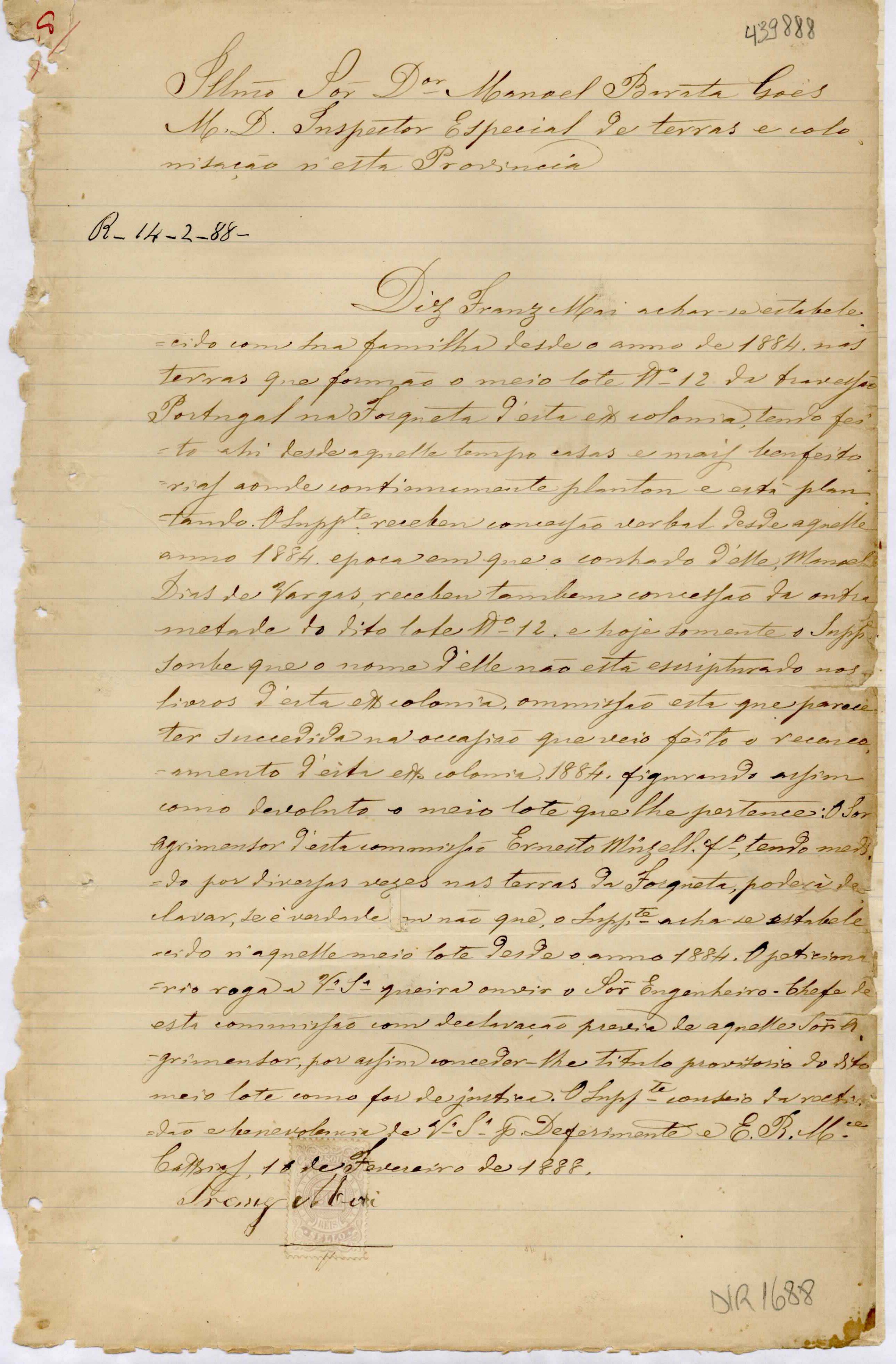 De Franz Mai - Caxias, para Manoel Barata Góes - Inspetor Especial de Terras e Colonização na Província. Assunto: solicita concessão de título provisório do ½ lote nº 12, travessão Portugal em Forqueta.