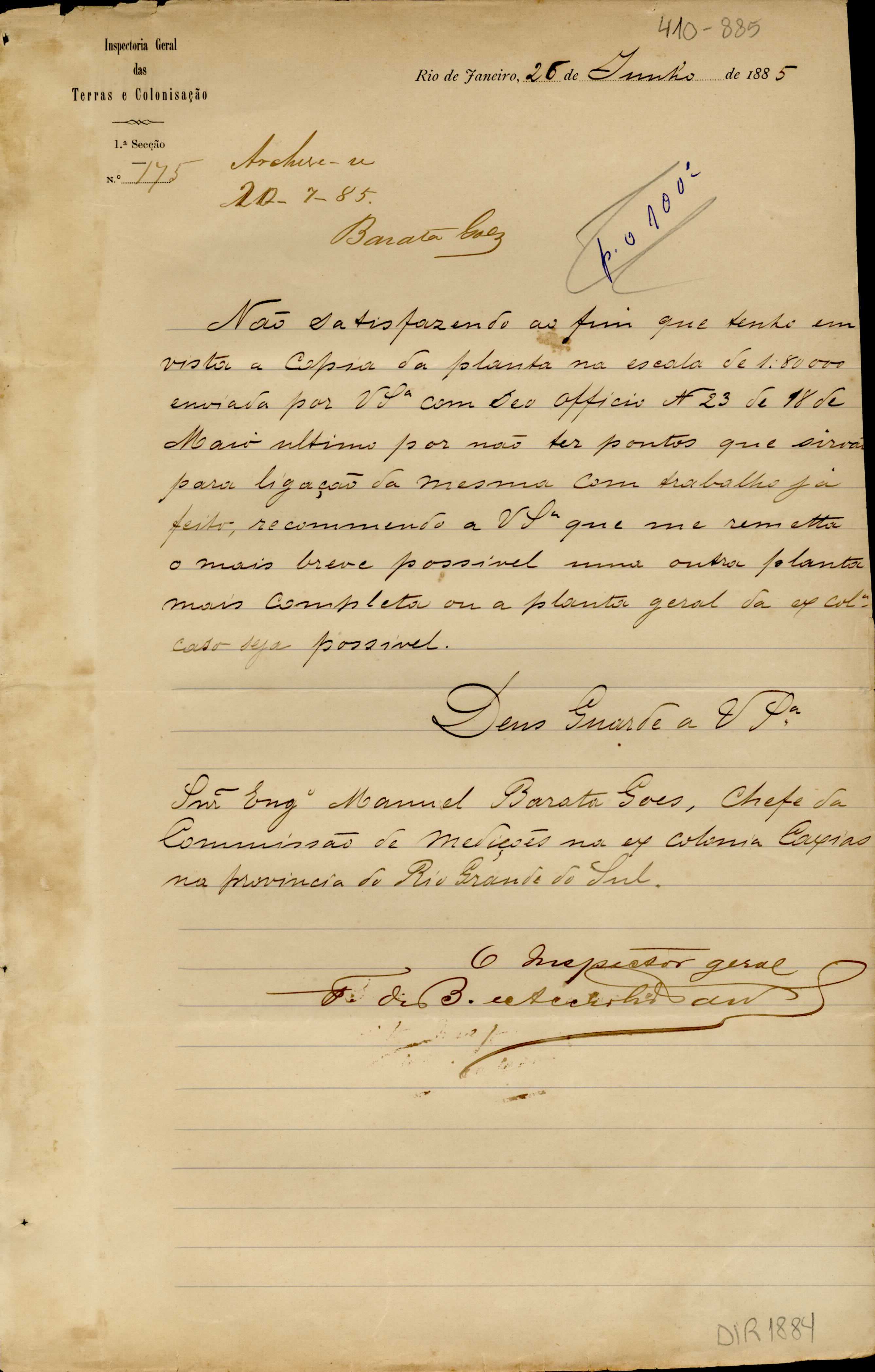 De Francisco de Barros e Accioli de Vasconcellos - Inspetor Geral das Terras e Colonização no RJ, para Manoel Barata Góes - Engenheiro Chefe de Medições na ex-Colônia Caxias. Assunto: solicita remessa de planta, mais completa do que a enviada em Maio, ou de planta geral da ex-colônia.