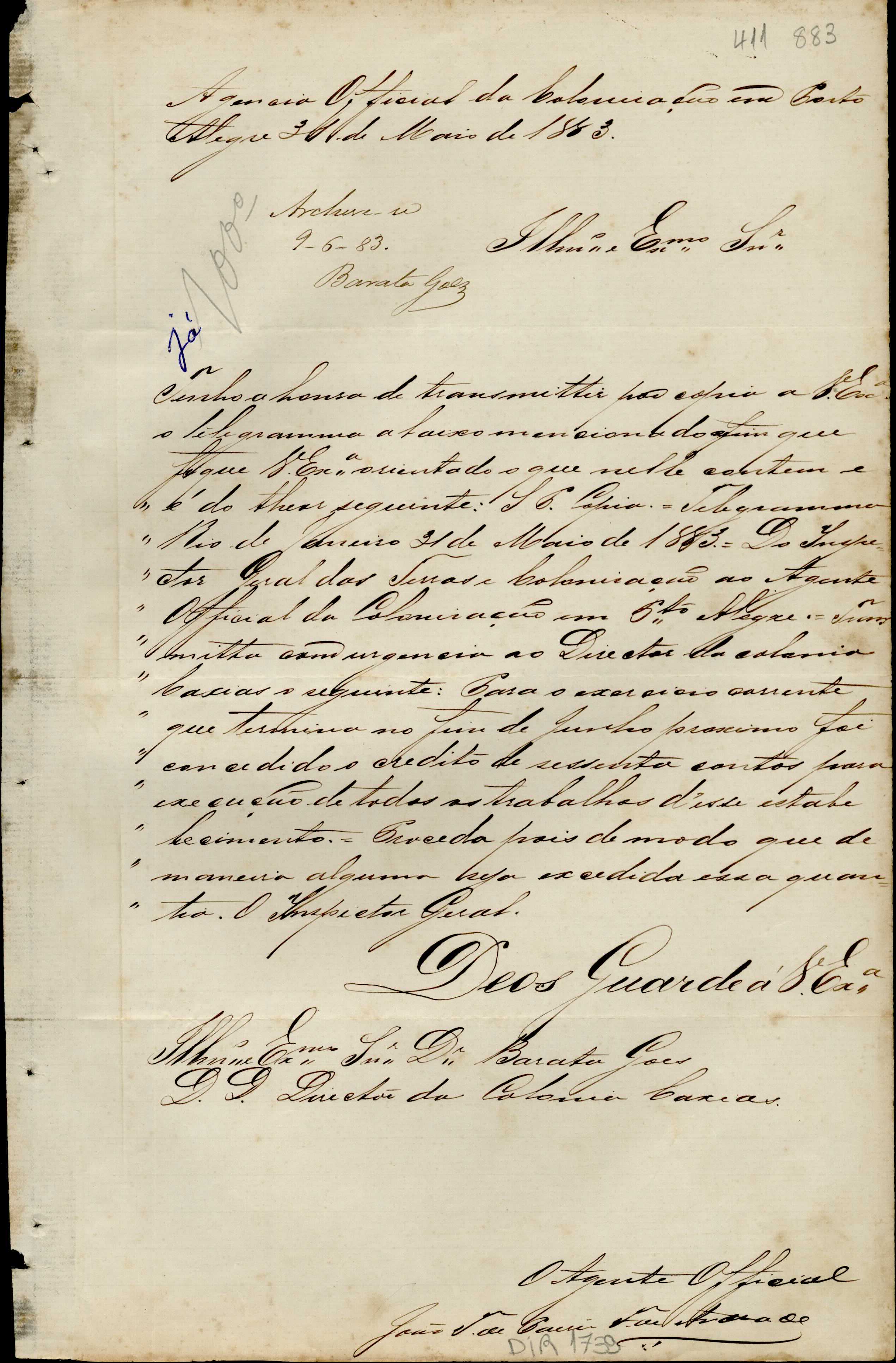 De João Teixeira de Paiva F. de Andrade - Agente Oficial da Colonização em Porto Alegre, para Manoel Barata Góes - Diretor da Colônia Caxias. Assunto: apresenta cópia do telegrama do Inspetor Geral das Terras e Colonização - RJ, comunicando o crédito para a execução dos trabalhos do estabelecimento.