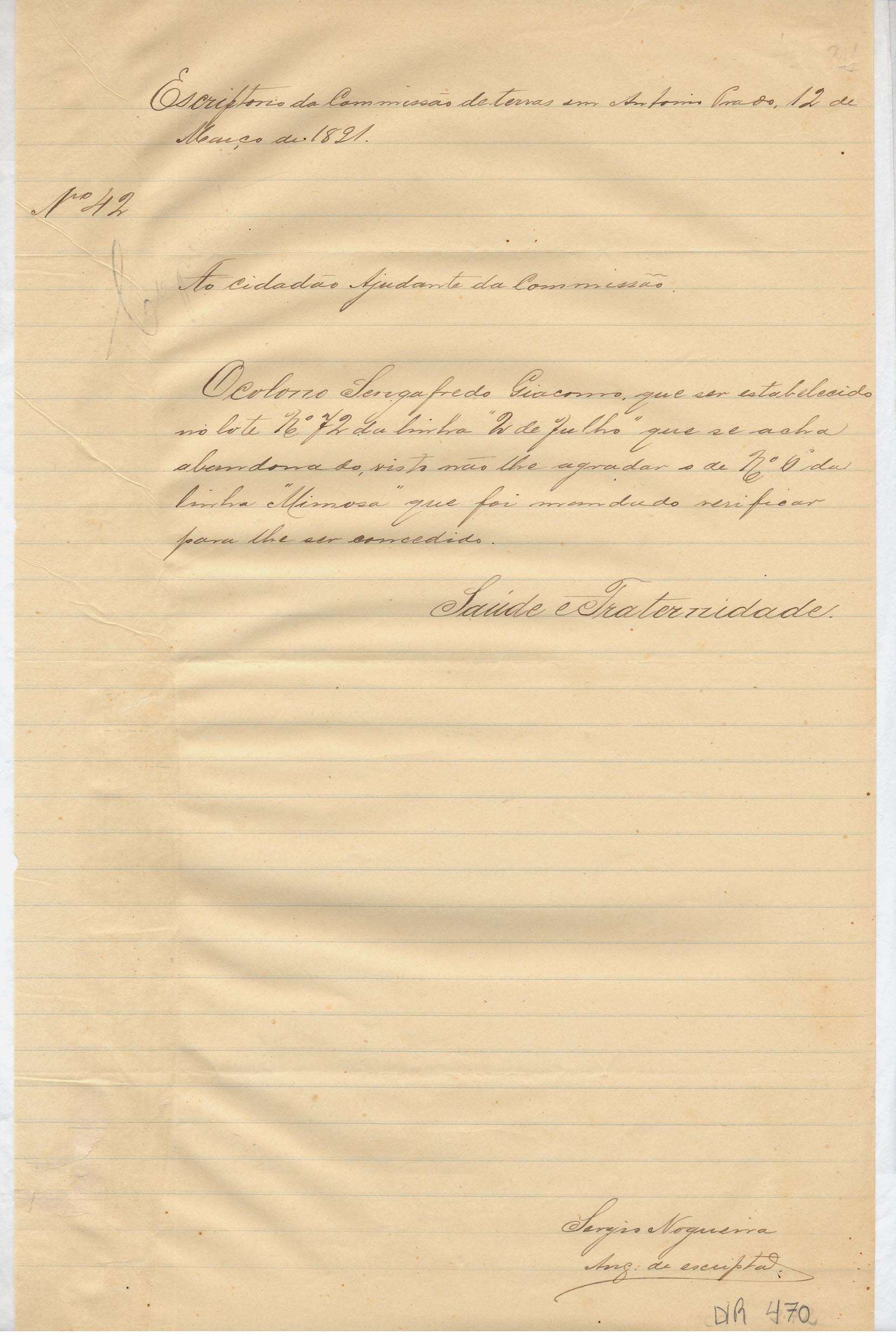 De Sérgio Nogueira - Auxiliar de Escrita da Comissão de Terras em Antonio Prado, para o Ajudante da Comissão. Assunto: comunica solicitação do colono Sengafredo Giacomo, para ser estabelecido no lote nº 72 da linha 2 de Julho, em vista de não lhe agradar o que lhe seria concedido.