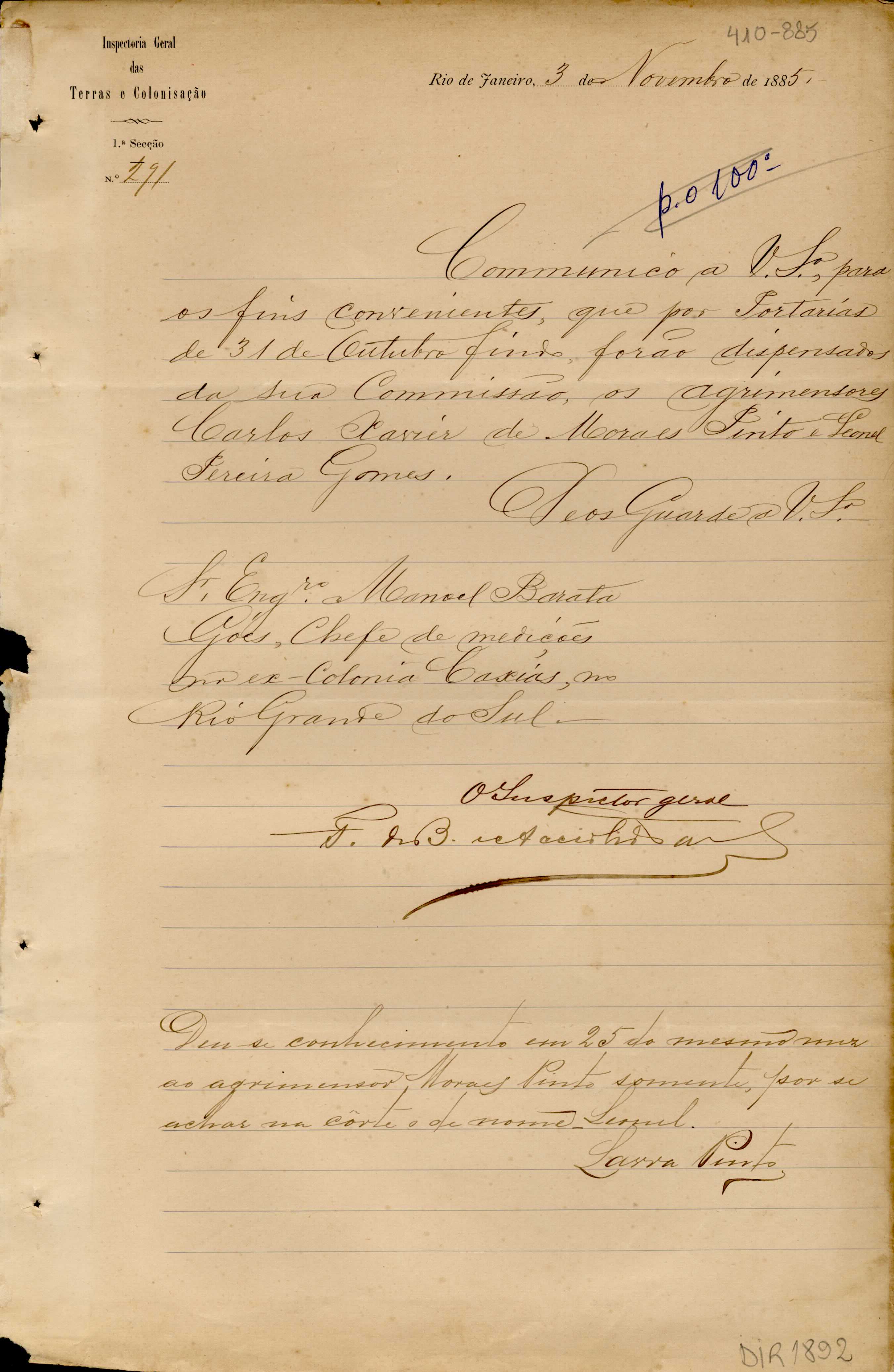 De Francisco de Barros e Accioli de Vasconcellos - Inspetor Geral das Terras e Colonização no RJ, para Manoel Barata Góes - Engenheiro Chefe de Medições na ex-Colônia Caxias. Assunto: comunica a exoneração dos agrimensores Carlos Xavier de Moraes Pinto e Leonel Pereira Gomes.