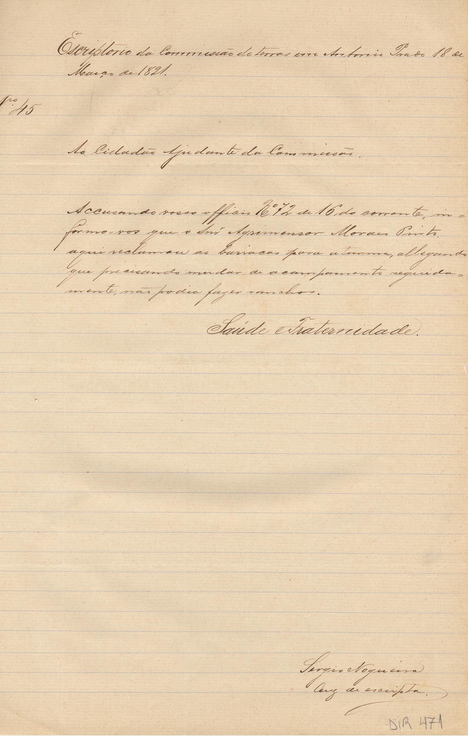 De Sérgio Nogueira - Auxiliar de Escrita da Comissão de Terras em Antonio Prado, para o Ajudante da Comissão. Assunto: comunica solicitação do agrimensor Moraes Pinto, de barracas para a turma.